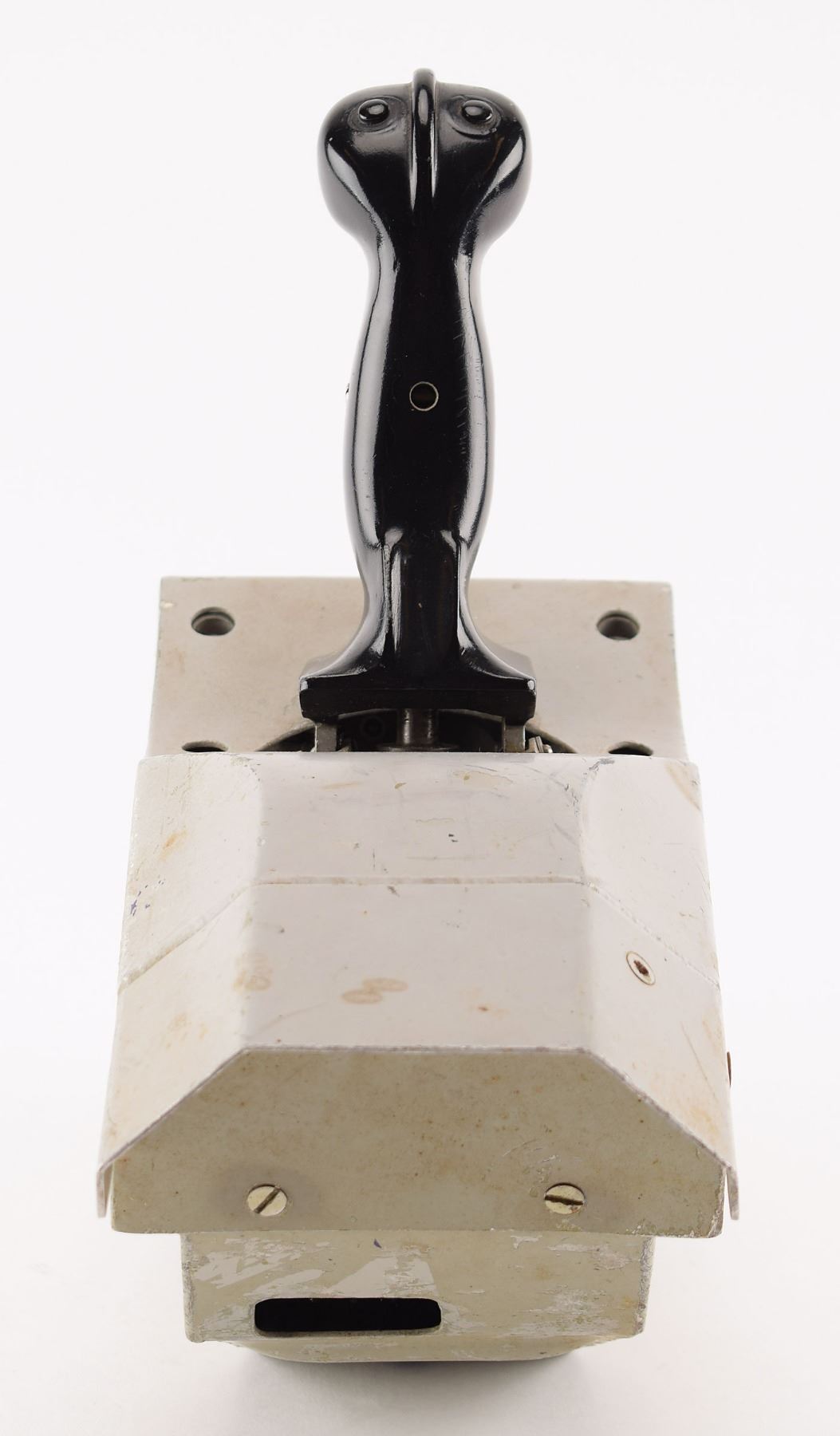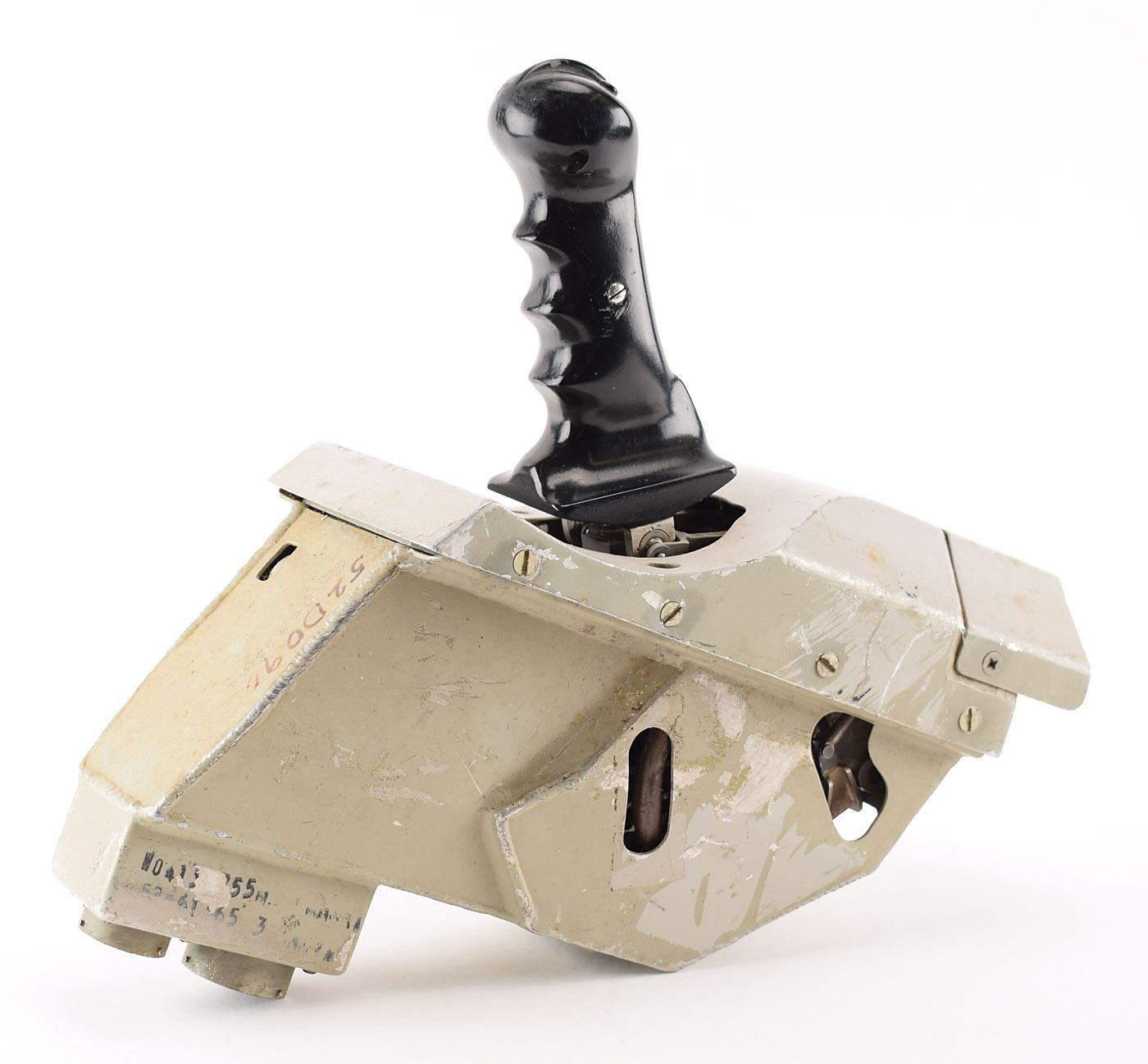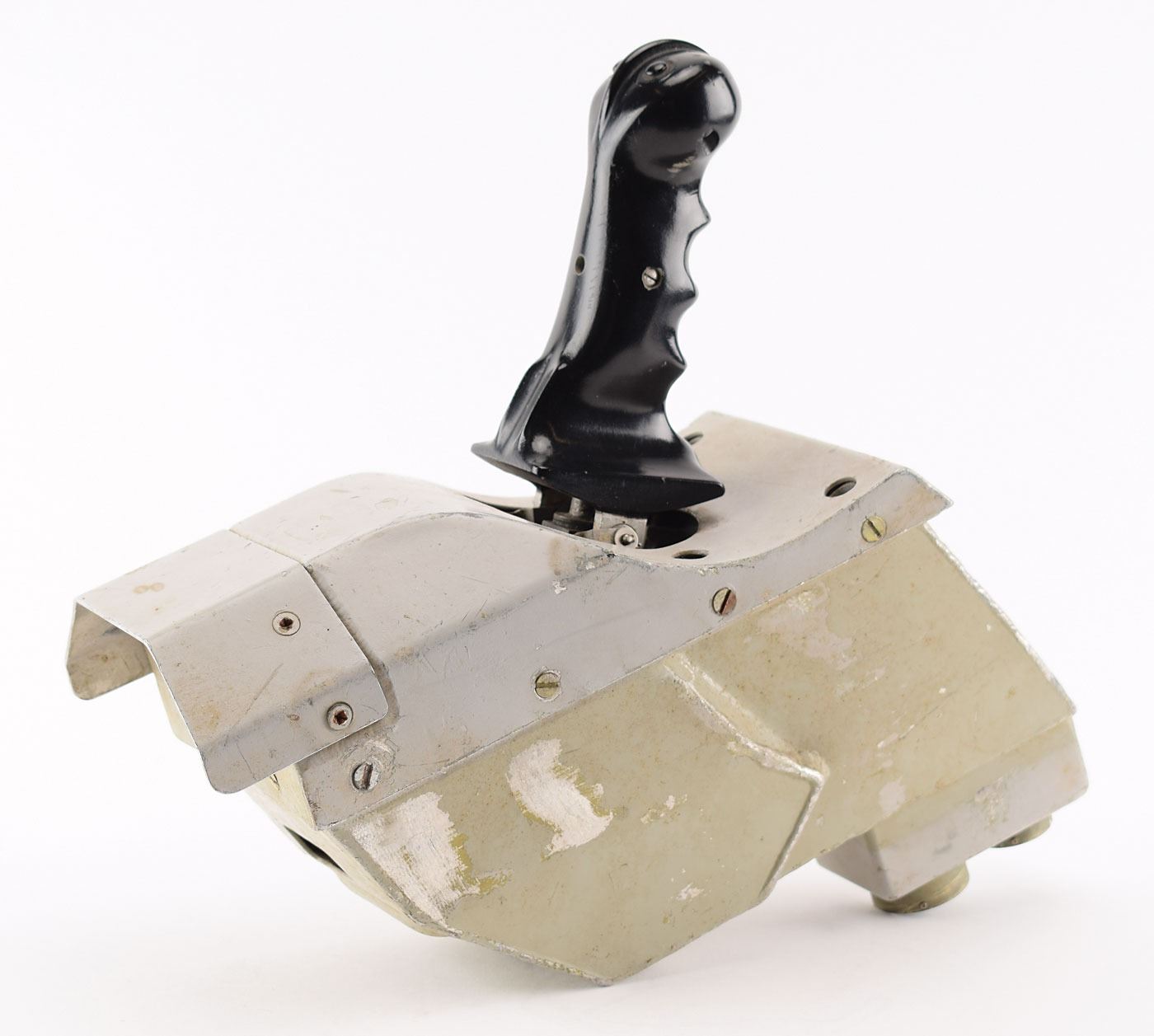 Extremely rare Gemini spacecraft attitude and translational hand controller in its gray metal housing, measuring an overall 13.5? x 12? x 5?, featuring a trainer-type handle grip with non-functional microphone buttons in the style used on Gemini 3 through 7. The part numbers stamped on the housing have been rendered partially indistinct. The three-axis controller design allowed an astronaut to adjust pitch, roll, and yaw of the spacecraft: a back-and-forth motion controlled pitch, a side-to-side motion controlled roll, and a twisting motion controlled yaw. The fly-by-wire Gemini controller represented a significant advancement in technology over the one used during the Mercury Program, which relied largely upon mechanical linkages; proven as reliable during the Gemini spaceflights, the fly-by-wire three-axis controller was subsequently further refined for Project Apollo. In fine condition, with expected signs of use and wear.