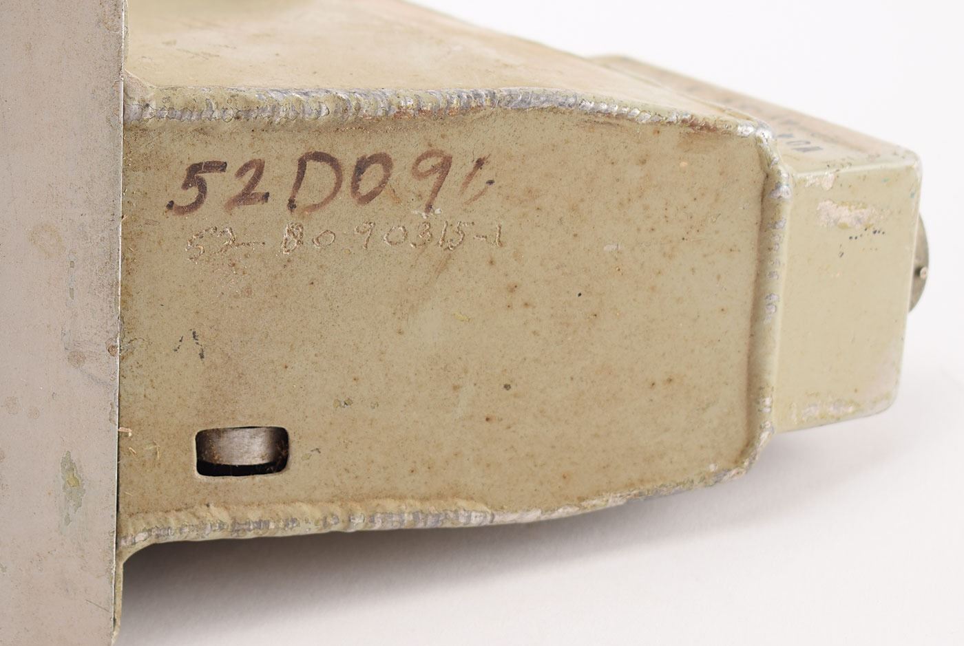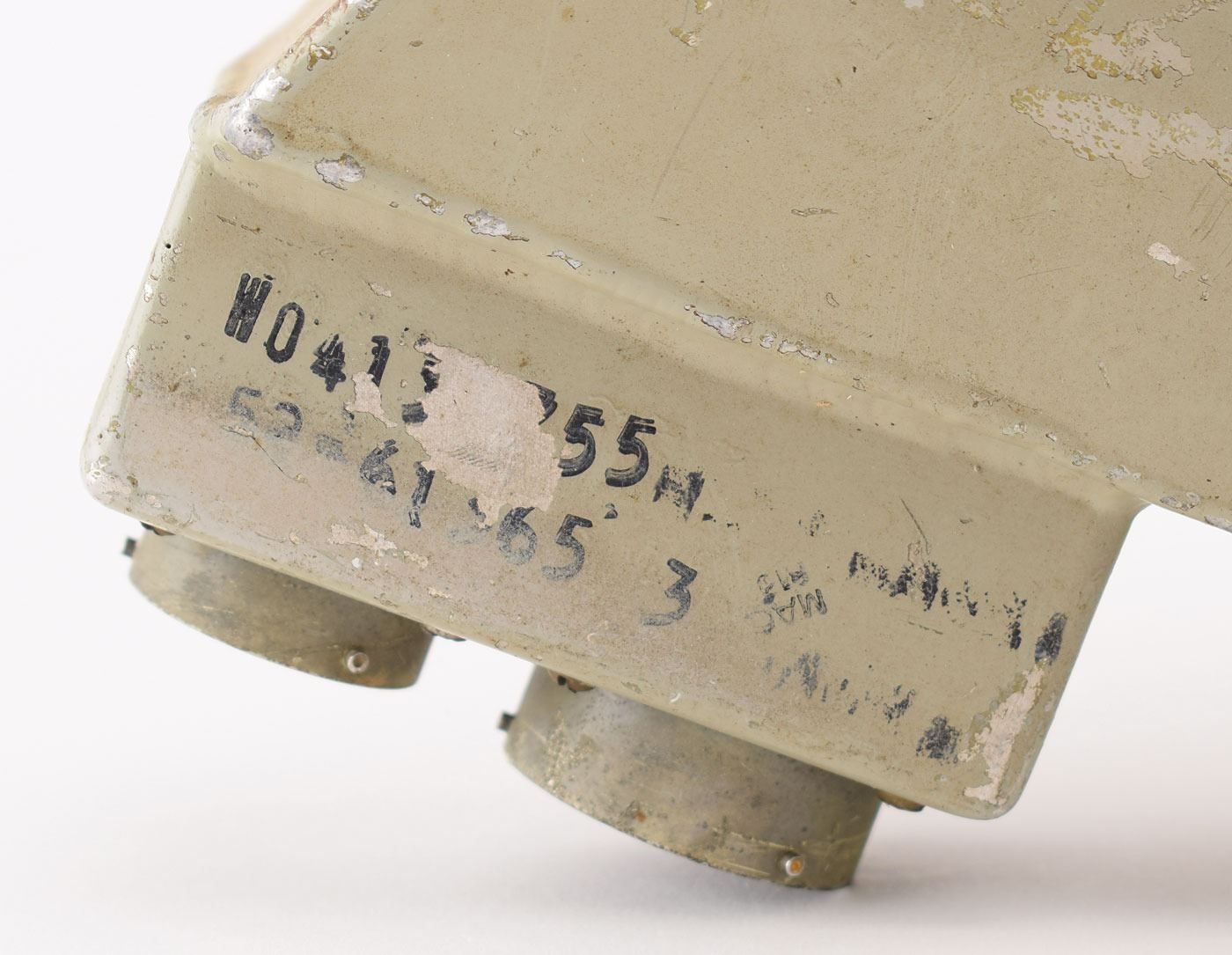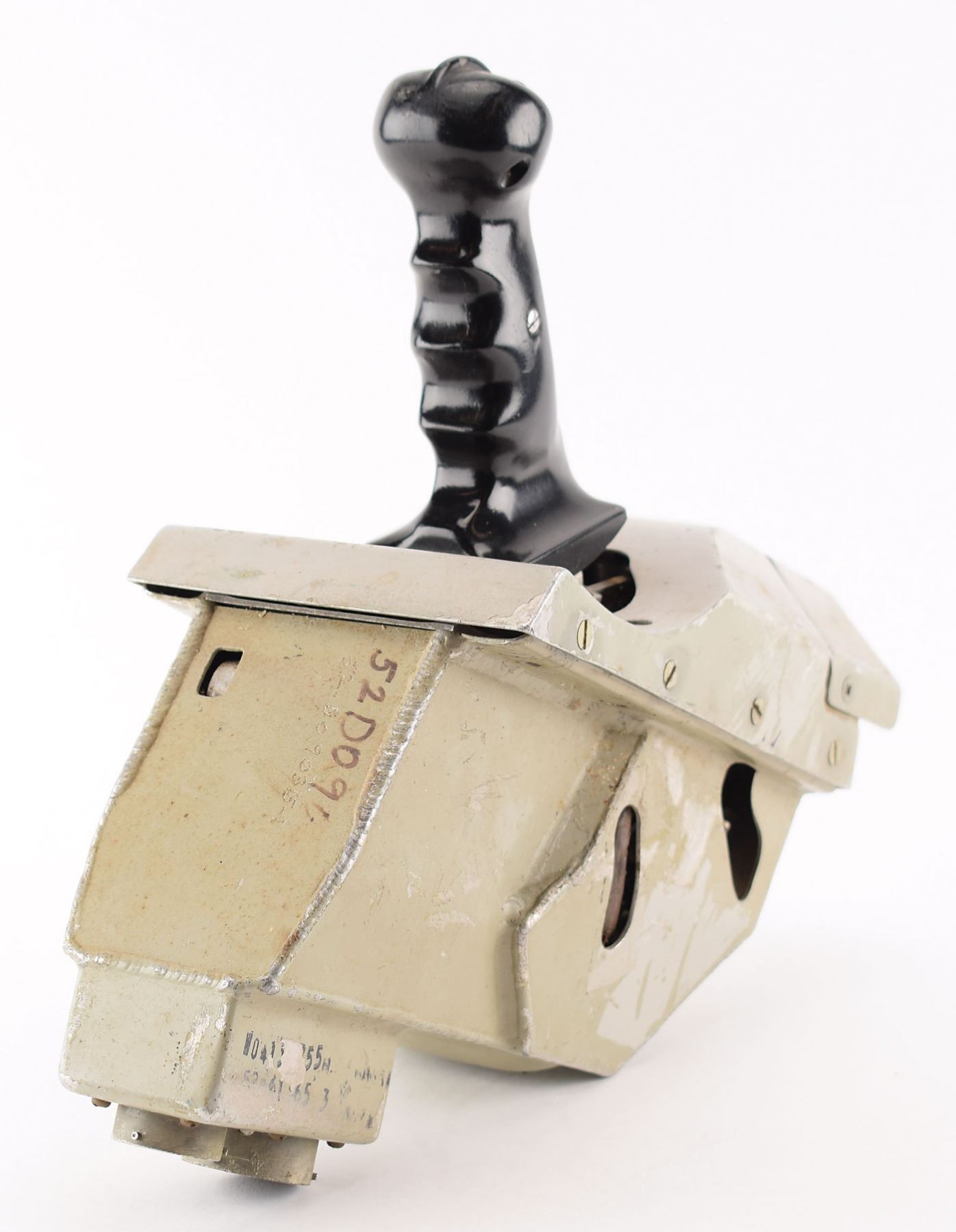 Extremely rare Gemini spacecraft attitude and translational hand controller in its gray metal housing, measuring an overall 13.5? x 12? x 5?, featuring a trainer-type handle grip with non-functional microphone buttons in the style used on Gemini 3 through 7. The part numbers stamped on the housing have been rendered partially indistinct. The three-axis controller design allowed an astronaut to adjust pitch, roll, and yaw of the spacecraft: a back-and-forth motion controlled pitch, a side-to-side motion controlled roll, and a twisting motion controlled yaw. The fly-by-wire Gemini controller represented a significant advancement in technology over the one used during the Mercury Program, which relied largely upon mechanical linkages; proven as reliable during the Gemini spaceflights, the fly-by-wire three-axis controller was subsequently further refined for Project Apollo. In fine condition, with expected signs of use and wear.