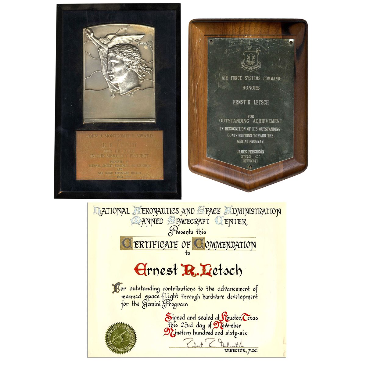 Lot of awards presented to Ernst R. Letsch in connection with his work on Project Gemini. Letsch's 14'' x 11'' Certificate of Commendation from NASA, dated 23 November 1966, has a gold seal and gilt embellishment. The Air Force System Commands award for Outstanding Achievement is a 7'' x 10'' plaque and the John J. Montgomery Award is a 6'' x 8.5'' plaque with a bas-relief image. Certificate is fine. Plaques are scratched in places, overall very good. Accompanied by an LOA from the Trustee of the Estate of Marion Linn Letsch, his wife.