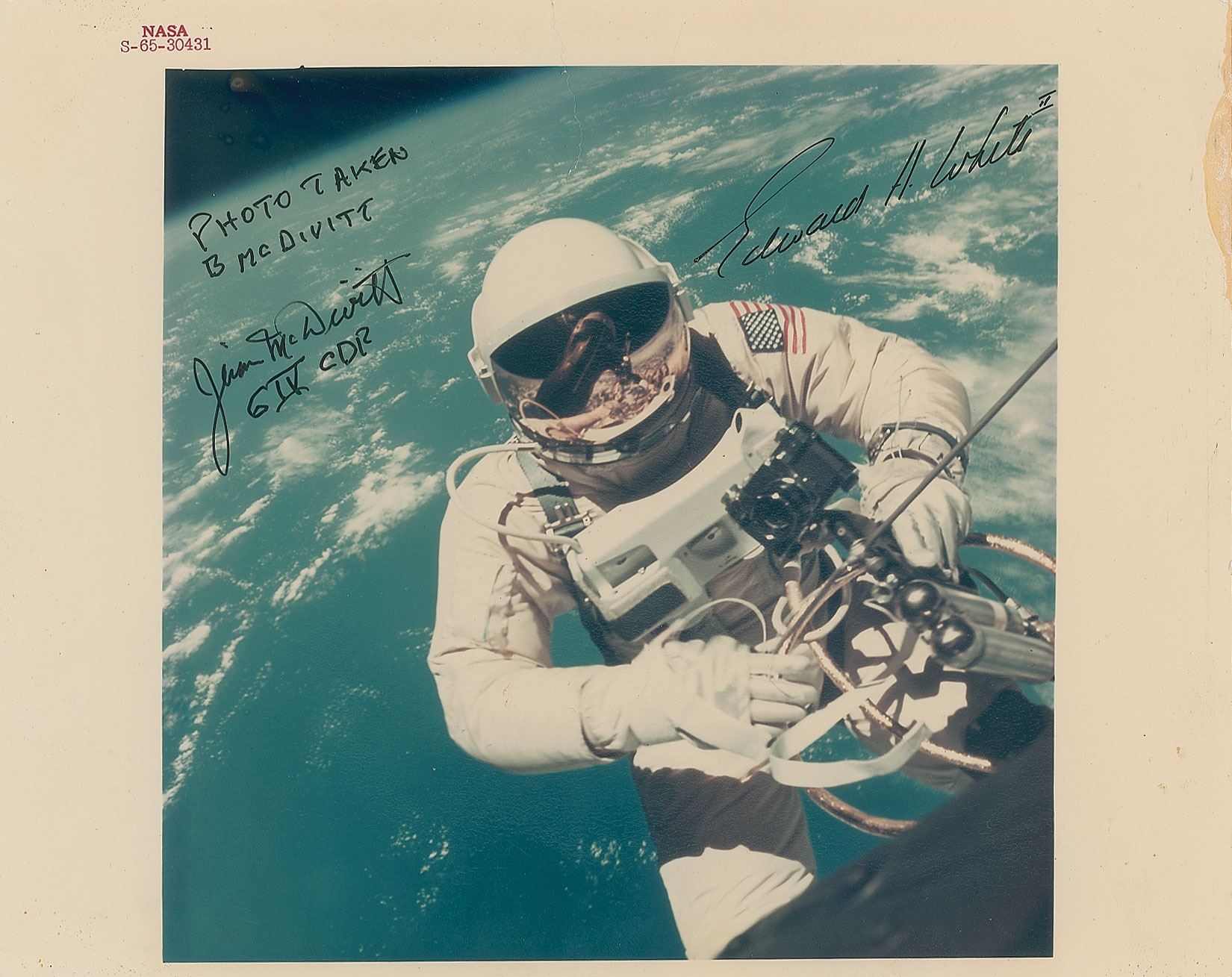 Official color 10 x 8 red-numbered NASA photo of Pilot Ed White performing his historic extravehicular activity, the first by an American astronaut, during the historic Gemini 4 mission, signed in black felt tip, "Edward H. White II" and "Jim McDivitt, GIV CDR," who adds above: "Photo taken B. McDivitt." Reverse bears "A Kodak Paper" watermarks. In very good condition, with a stain to the right border, light emulsion irregularity, and a vertical tear to the top center, stopping just above White's helmet. Accompanied by a full letter of authenticity from Zarelli Space Authentication.