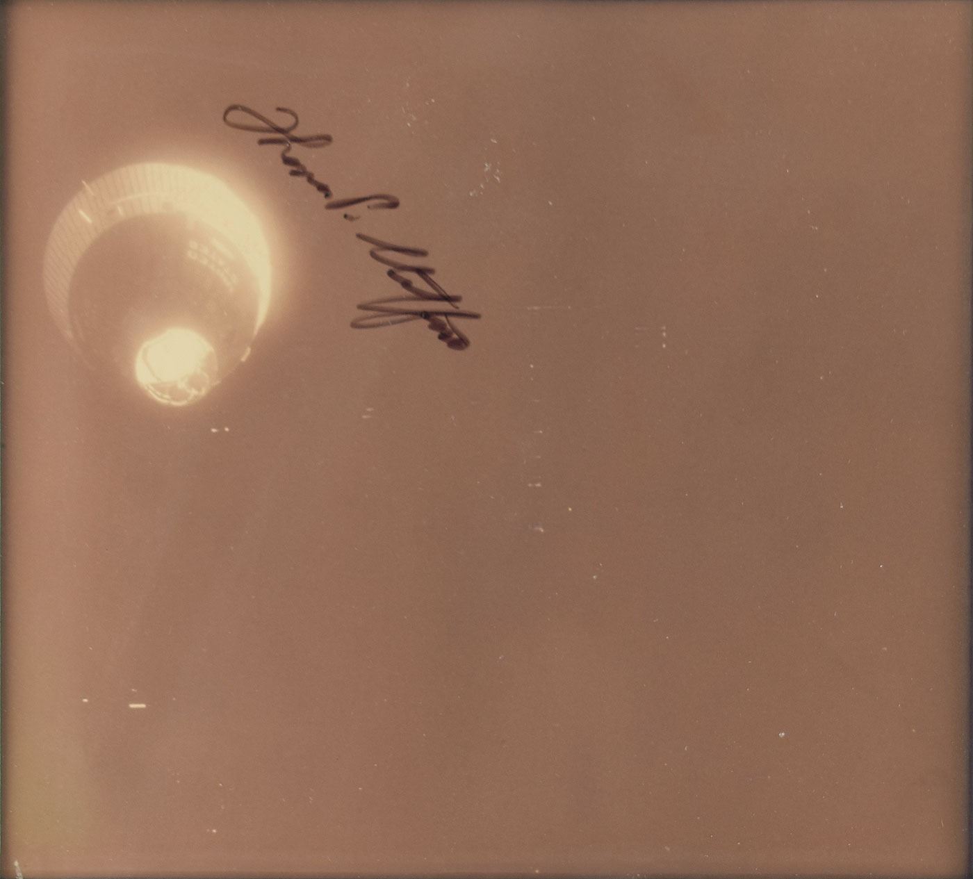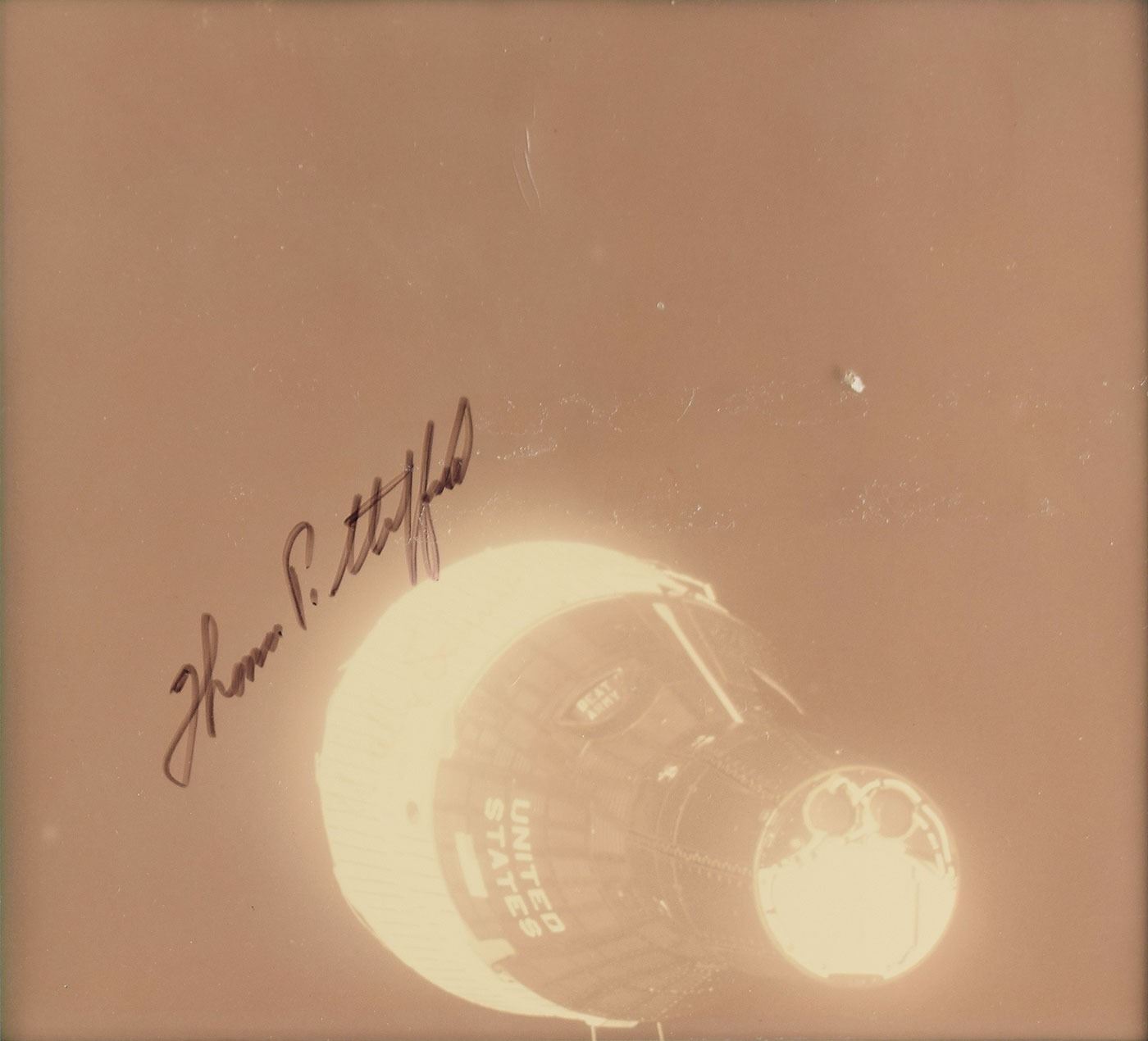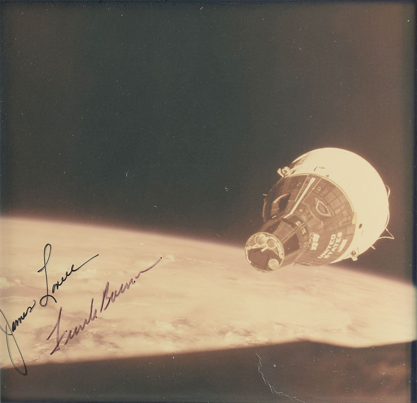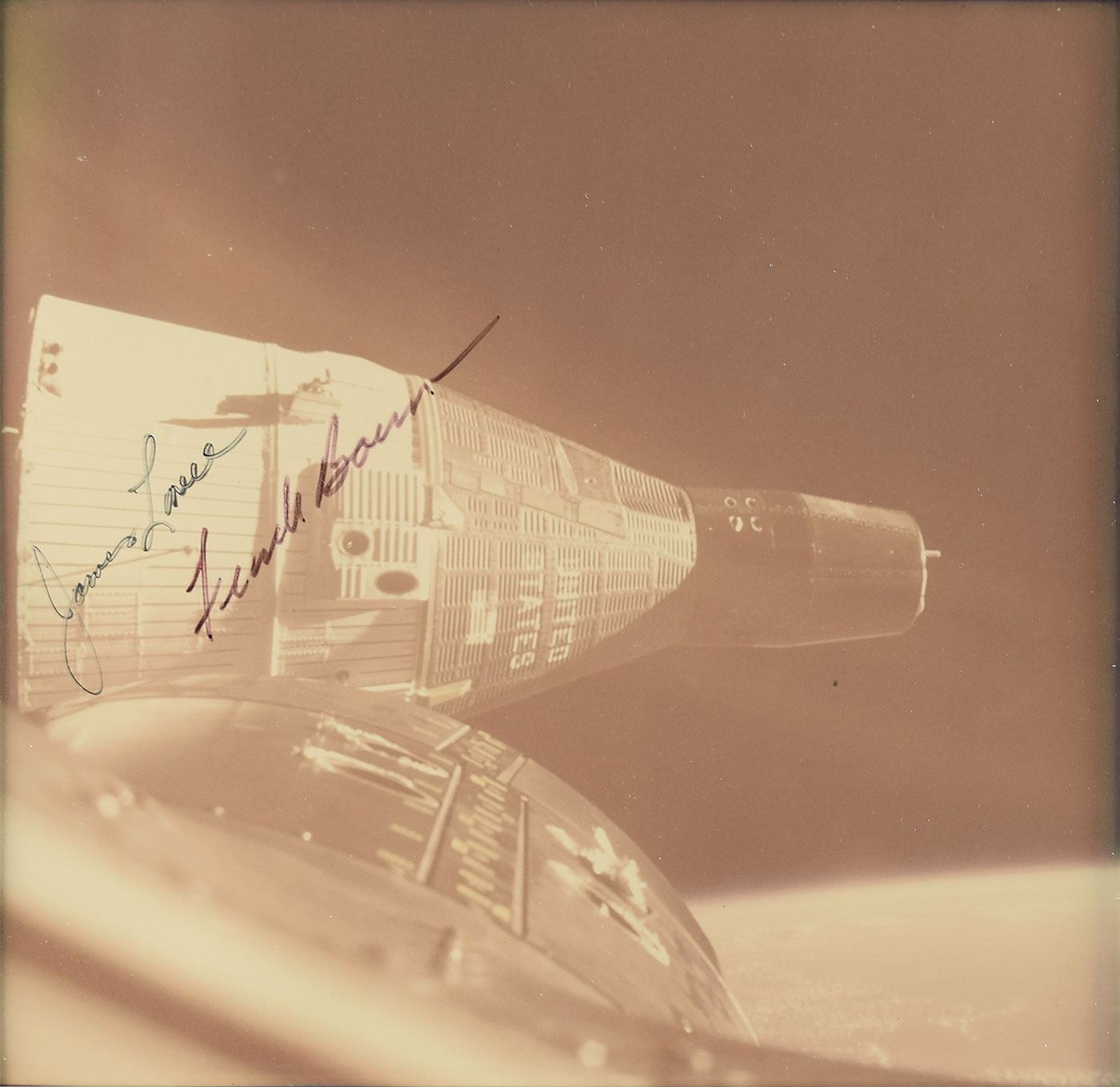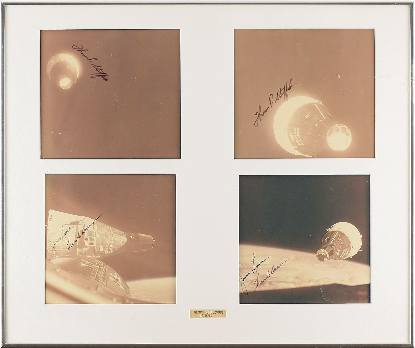 Appealing display containing four vintage color photos documenting the historic rendezvous between the spacecraft of the Gemini 6A and Gemini 7 missions, each photo approximately 7.25 x 6.75, with the two upper photos signed in black felt tip, "Thomas P. Stafford," and the lower two both signed, "James Lovell" and "Frank Borman." The photos are matted and framed to an overall size of 22.25 x 18.25. In fine condition, with light fading to the photos. Originates from the personal collection of Manfred 'Dutch' von Ehrenfried, a Mercury, Gemini and Apollo Flight Controller, Apollo Pressure Suit Test Subject, NASA hi-altitude aircraft crew member, Mission Staff Engineer and Branch Chief from 1961–1971.