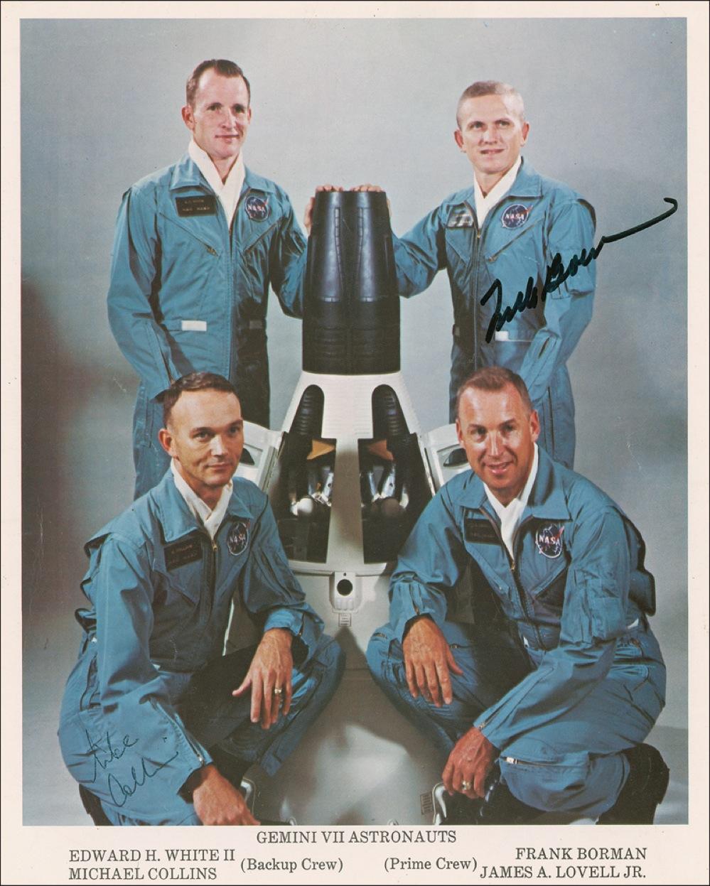 Gemini VII NASA photo signed by Michael Collins and Frank Borman. Color 8” x 10” NASA photo of the Gemini VII prime and back-up crews posing with a model of their capsule, signed in black ballpoint by Michael Collins and in black felt tip by Frank Borman. In fine condition, with a few light bends and creases, and some light skipping to Collins’s signature.