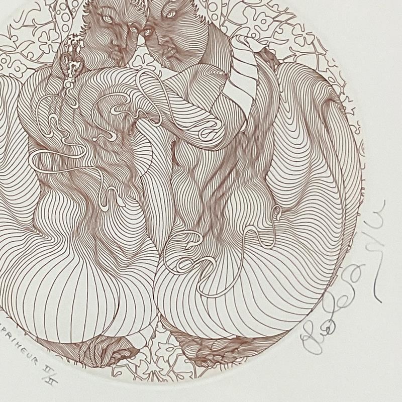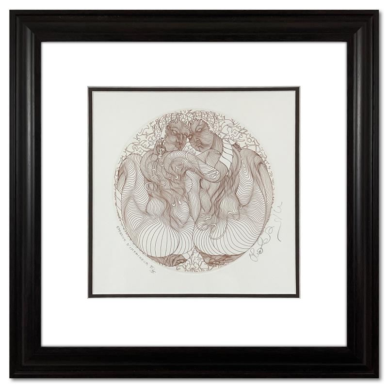 "Gemini" is a limited edition etching on paper by Guillaume Azoulay, numbered II/II and hand signed by the artist. This piece comes custom framed. Includes Letter of Authenticity. Measures approx. 20.5" x 20.5" (frame), 9" (image-diameter).