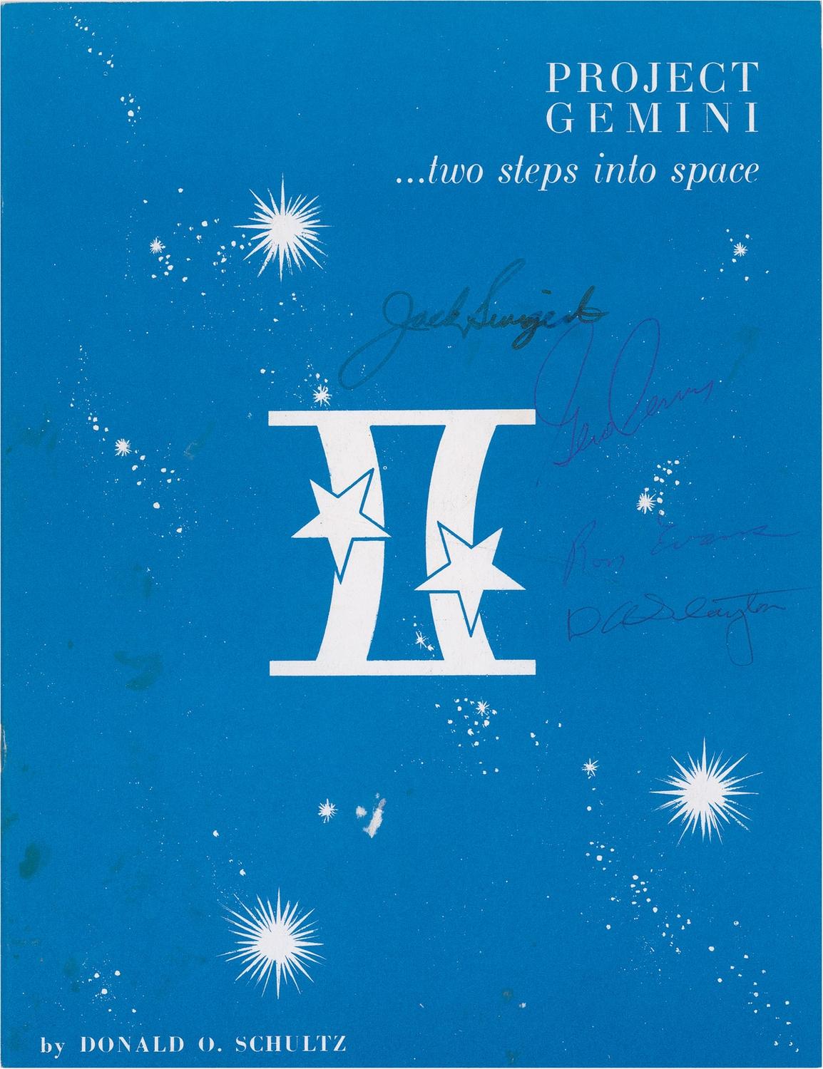 Signed booklet: “Project Gemini…two steps into space.” Wisconsin: Badger Printing Corporation, 1967. Softcover, 8.5 x 11, 36 pages. Signed on the front cover in black felt tip by Jack Swigert, and in ballpoint by Gene Cernan, Ron Evans, and Deke Slayton. In fine condition, with some scattered light soiling to front cover, and portions of Swigert’s signature just a shade light, but completely legible.