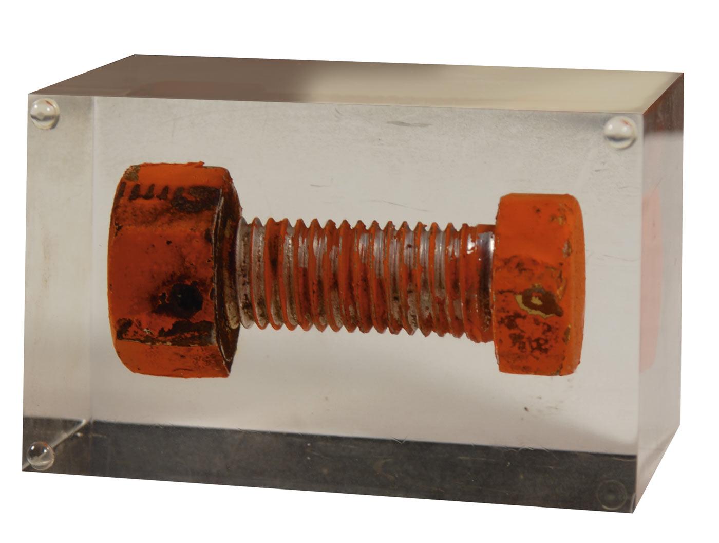 Huge bolt removed from the Pad 19 launch tower, the site of nearly all Gemini mission flights. Measuring about 3” long, the bolt is covered in a reddish-orange anti-corrosion paint that was used in the launch facility and is encased in a 4 x 2.5 x 2.5 clear plastic block that shows moderate signs of past viewing and handling.
