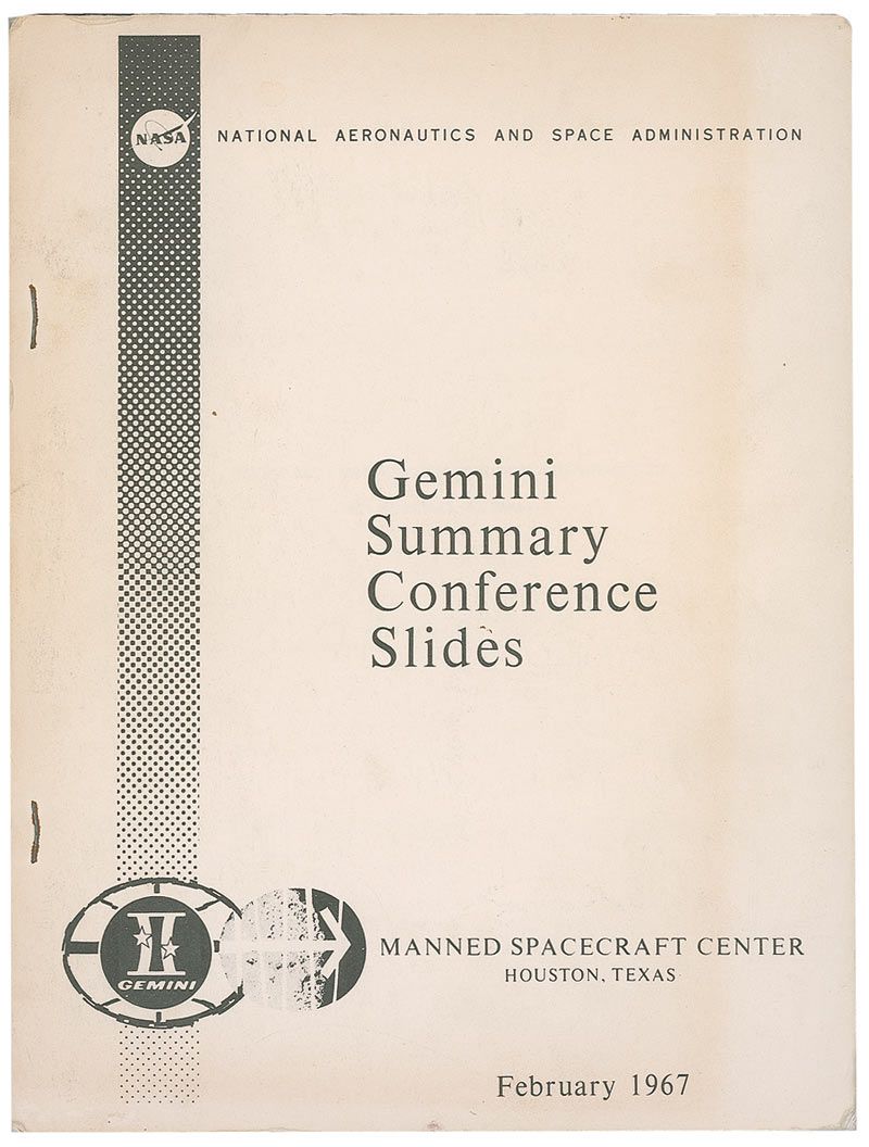 Official NASA Gemini Summary Conference Slides manual used at the Manned Spacecraft Center in Houston, Texas in February of 1967, 8 x 10.5, featuring photos, illustrations, and graphs relevant to the mission. In very good condition, with block of toning, creasing, and light rubbing to the front cover, and two binding staples along the left edge.