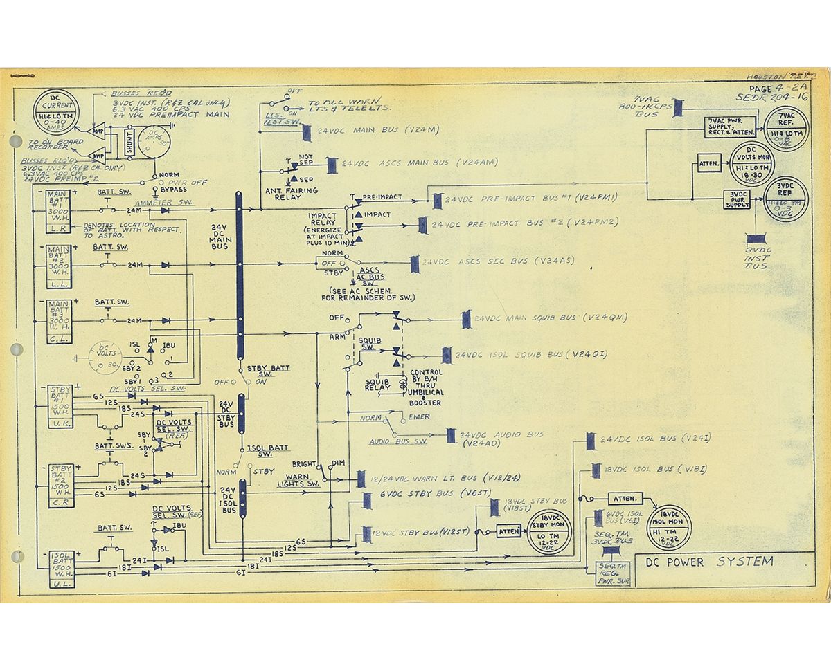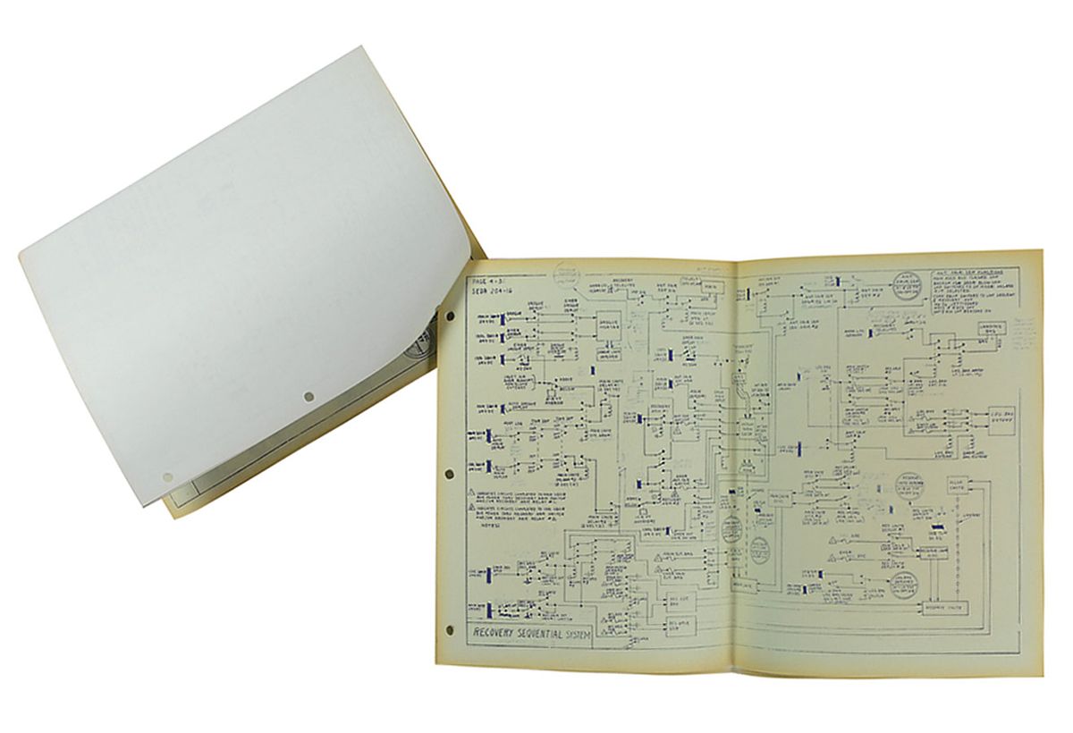 Set of 20 different blueprints for various systems of the Gemini Capsule, 17 x 11, including power systems, “retrograde sequential system,” “post impact sequential system,” “communications system,” “ASCS thrust control and sequencing,” “instrumentation system,” “periscope system,” “clock system,” and “bio-medical system.” A central vertical fold, toning to the borders, and a rusty binding staple to the upper left corner, otherwise fine condition. Provenance: Aurora Auction, November 2003, The Deke Slayton Estate collection.