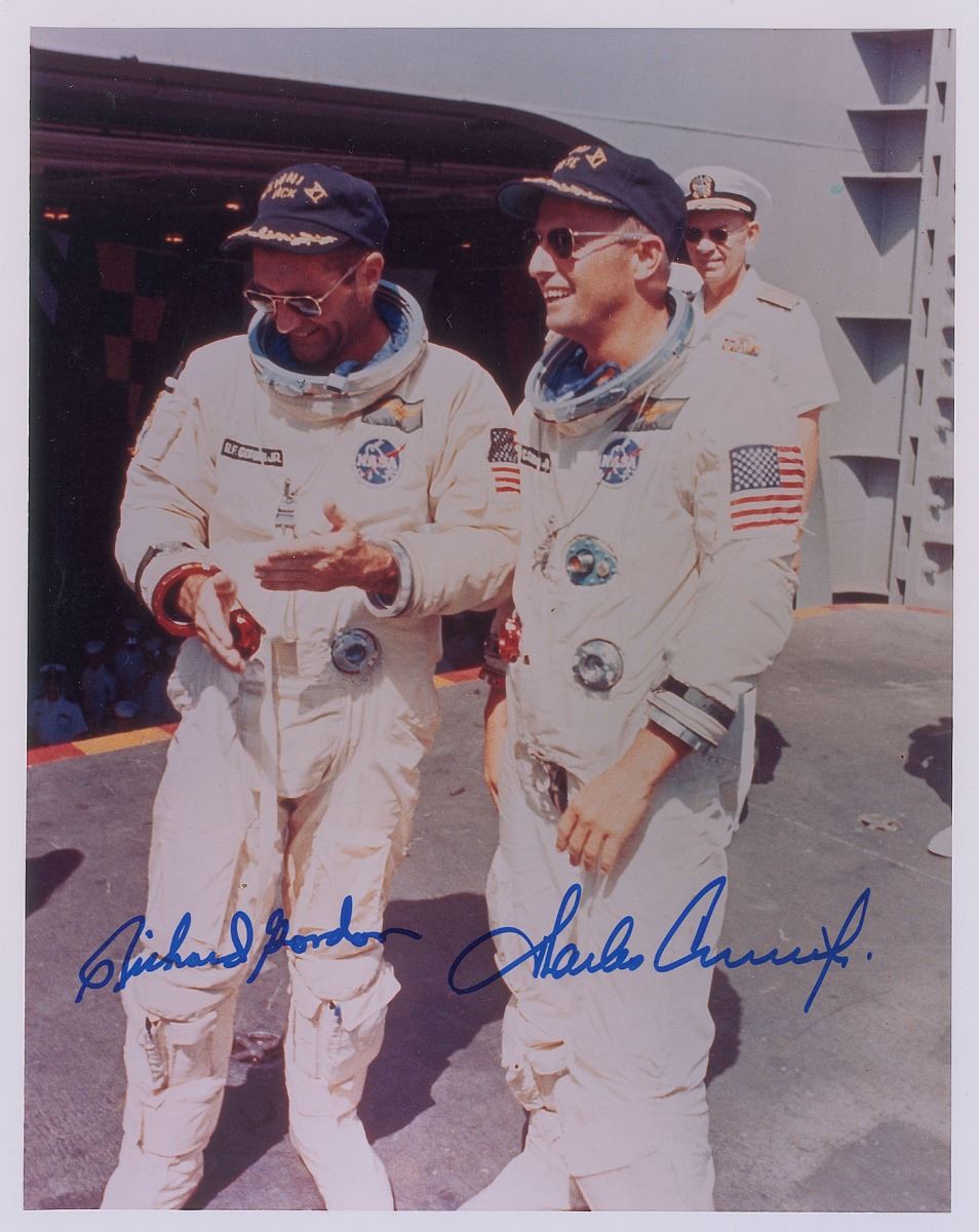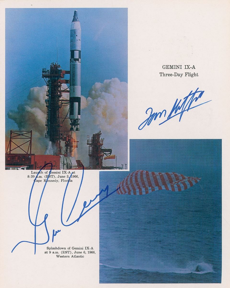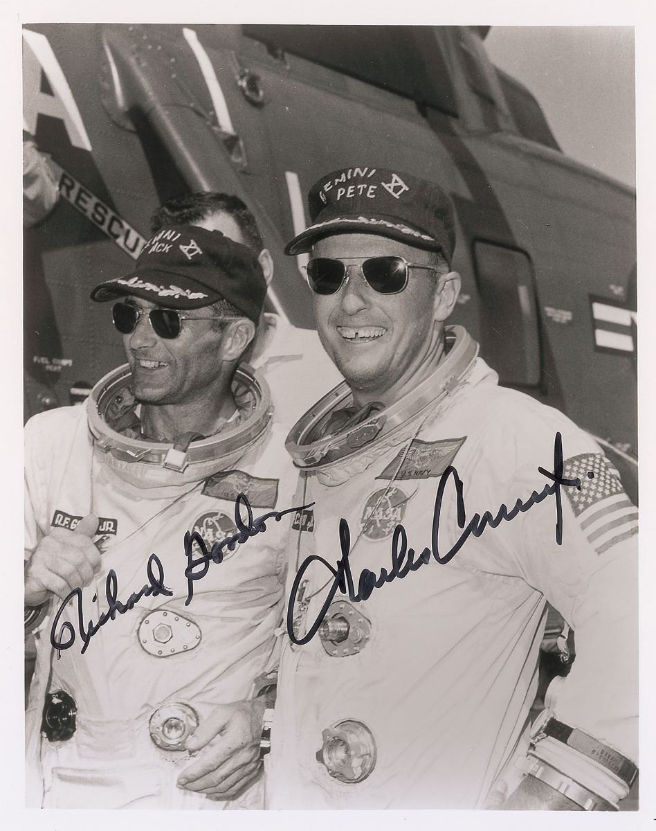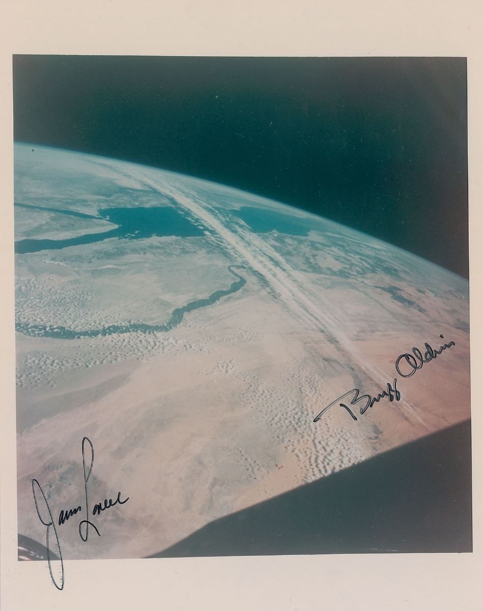 Desirable collection of four crew-signed photos: an official color 8 x 10 NASA lithograph depicting the launch and splashdown of Gemini 9, signed in blue felt tip by Gene Cernan and Tom Stafford; two different 8 x 10 photos of the Gemini 11 crew after recovery, both signed in felt tip by Richard Gordon and Charles Conrad; and an exceptional glossy 8.5 x 11 double-weight McDonnell Aircraft Corporation aerial photo of Egypt and the Sinai peninsula, signed in black felt tip by James Lovell and Buzz Aldrin. In overall fine condition. From the Leon Ford Collection.