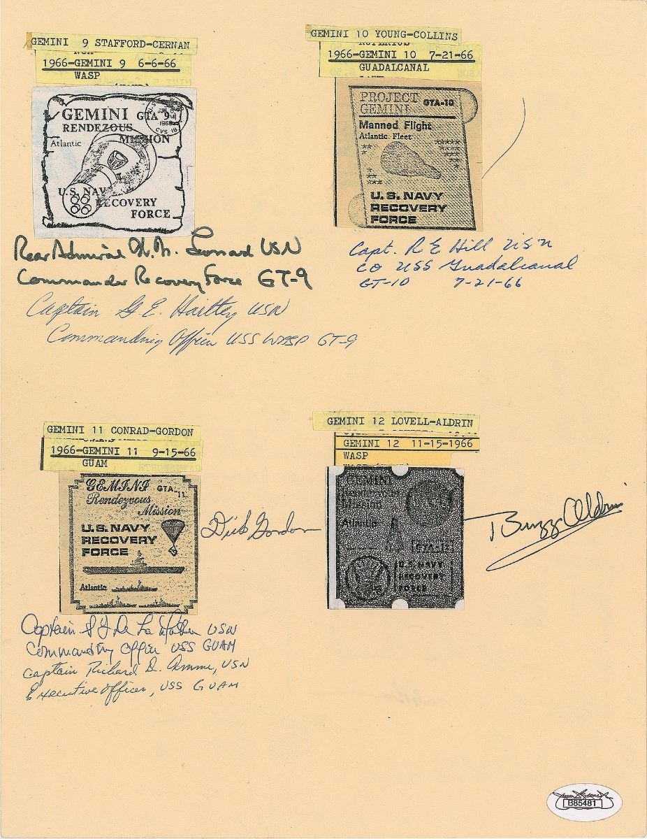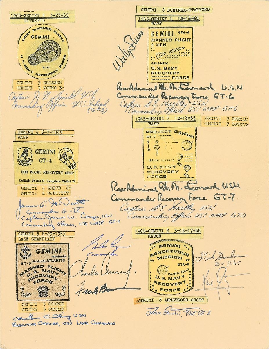 Uncommon souvenir display celebrating Gemini missions 3–12, signed on both sides of a beige 8.5 x 11 sheet with affixed mission specific captions in ballpoint or felt tip by nine astronauts, including: “James G. McDivitt, Commander G–IV,” “Charles Conrad,” “Gordon Cooper, Commander,” “Wally Schirra,” “Frank Borman,” “Dick Gordon, B-U Pilot,” “Neil Armstrong,” “Dave Scott, Pilot, GT-8,” and, on the reverse, “Buzz Aldrin,” with Gordon signing his name once more. Also signed by several military officials related to the Gemini recovery vessels. In fine condition. Accompanied by a full letter of authenticity from JSA.
