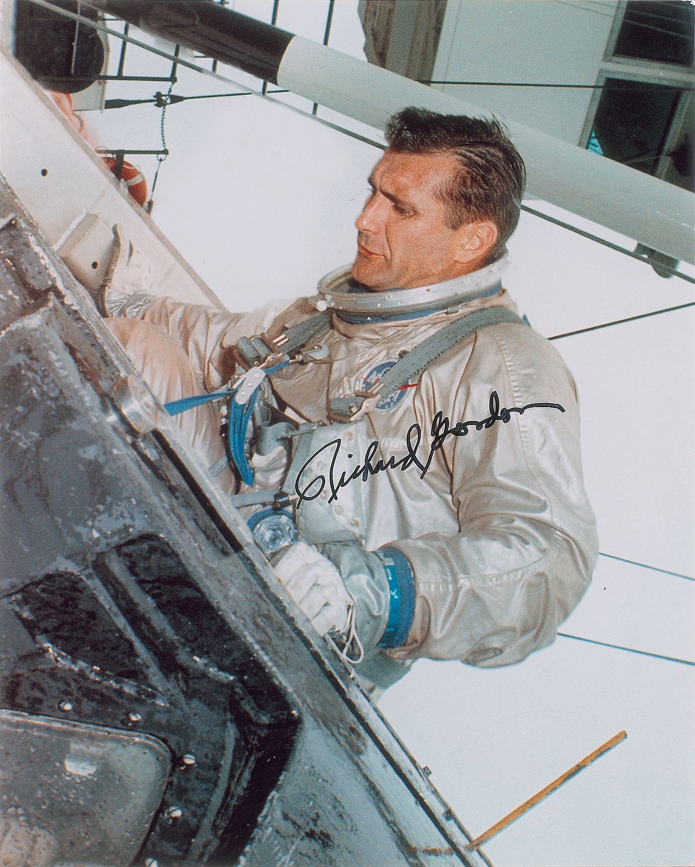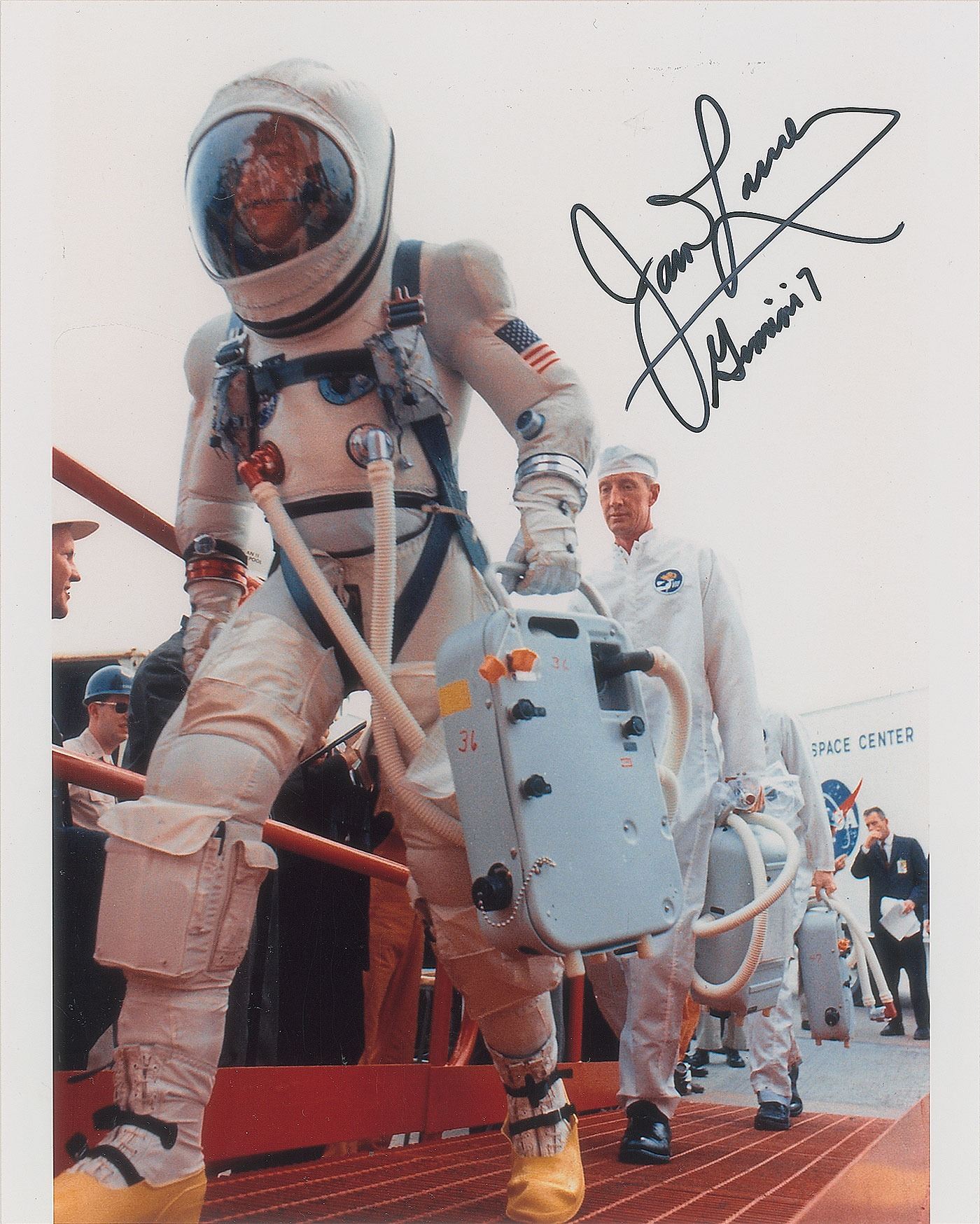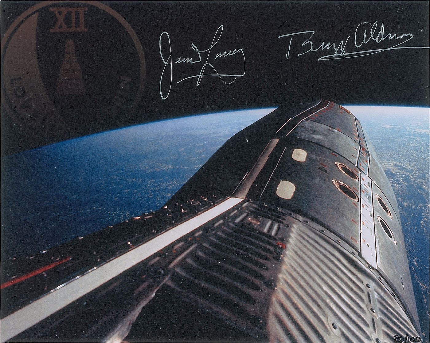 Three color semi-glossy photos: an 8 x 10 full-length photo of James Lovell walking in his space suit, signed in black felt tip and adding "Gemini 7"; an 8 x 10 photo of Richard Gordon lifting himself from a capsule, signed in black felt tip; and a limited edition 10 x 8 photo of the Gemini 12 capsule high above Earth, numbered 86/100, signed in silver ink by James Lovell and Buzz Aldrin. In overall fine to very fine condition.
