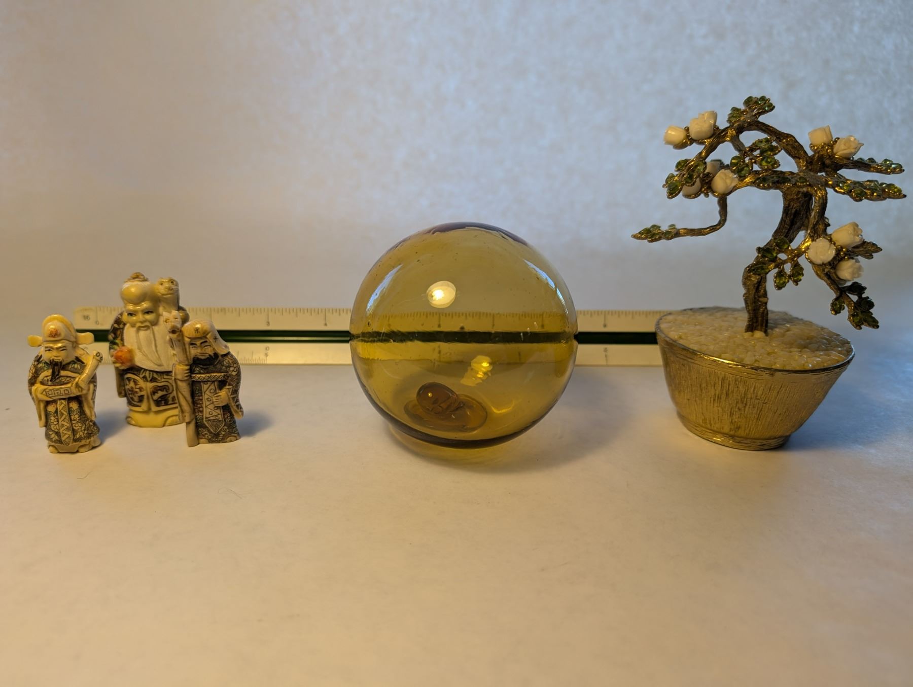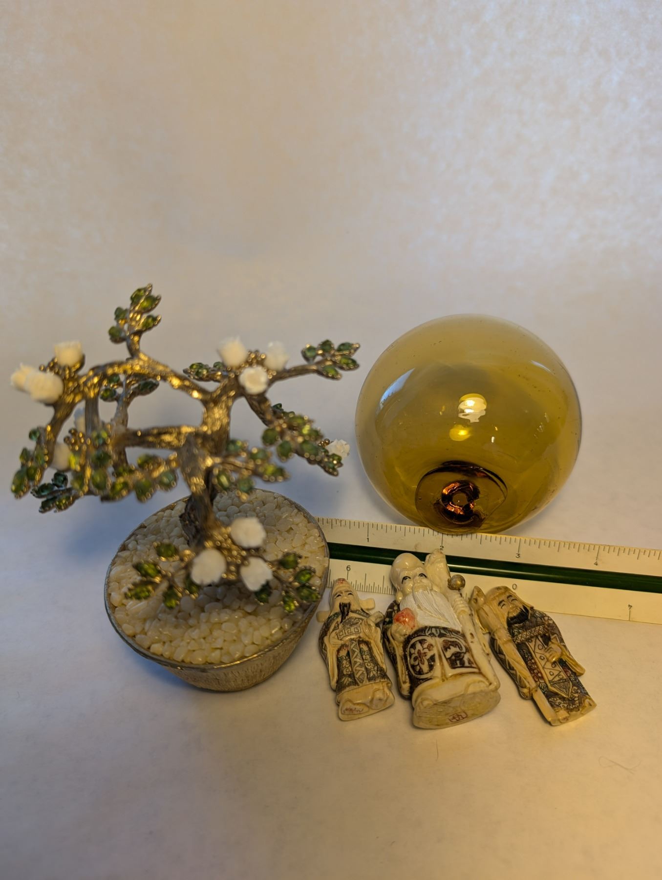 Gemstone Bonzi Tree/ Asian God Resin Figurine and Amber Glass Fish Float