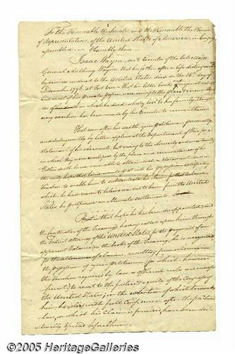 <B>Gen. Anthony Wayne's Son Petitions Congress Document</B></I> A six plus page manuscript document, 10" x 16", not dated (but likely circa 1810), addressed to the Senate and House of Representatives by Isaac Wayne, son and executor of the estate of General Wayne. General "Mad" Anthony Wayne, one of the best generals on the colonial side in the American Revolution, died December 15, 1796 at Fort Erie after a severe attack of gout. Isaac claims that he was never able to reclaim his father's <I>"letter books and original entries and most of his private papers, owing to the place & circumstances in which he died..."</B></I> Apparently Isaac had been asked by the Comptroller of the U.S. Treasury to pay a balance. He refutes the claims in detail, point by point. One claim involves <I>"...rations, drawn from the Commissary Genl at Greenville, Miami and Detroit, in August, September & Novr. 1796..."</B></I>; these were drawn by Gen. Wayne, who was <I>"surrounded by crowds of starving and necessitous Indians...."</B></I> Isaac reminds the Congress that his father was appointed <I>"as sole Commissioner... for negotiating a treaty, with the Western Indians...,"</B></I> that he <I>"was ordered upon Services of a Secret and critical nature, and that he never afterward returned to his family, dying in the Western Wilderness...."</B></I> He expresses confidence that the <I>"Justice of the National Legislature will relieve the Settlement of the Accounts of so distinguished a Citizen and Soldier..."</B></I> The first three pages are fine; the 4th has some edge darkening in one area and a fold split that affects a couple of words. The last two pages and docket leaf are stained and rough at the right margin, affecting several words; also some lighter fold stains. An eloquent and historical document with much detail about the last months of General Wayne's life. Includes an engraving of Anthony Wayne. Provenance: the Ridgway - Wayne estate. Lot:253