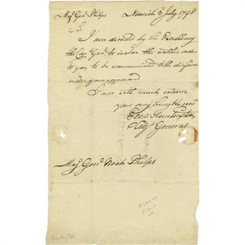 <B>General Ebenezer Huntington Letter to Major General Noah Phelps.</B></I> One page, 7.5” x 12”, Norwich, July 2, 1798, to Major General Noah Phelps, Symsbury. A letter written from one notable Revolutionary War officer to another. It reads in part: “<I>I am directed by his Excellency…to inclose sic the written order to you, to be communicated to the divisions under your command.</B></I>” General Huntington served with the First and Third Connecticut Regiments and served until discharged in 1800. As a captain during the Revolutionary War, Noah Phelps, acting as a spy was able to gather intelligence which allowed General Ethan Allen to take Fort Ticonderoga. The letter is toned but the ink is bright, with the usual fold creases, else near fine. <I>From the collection of Henry E. Luhrs.</B></I><BR><BR><b>Shipping:</b> Flat Material, Small (<a target="_blank" href="http://www.heritageauctions.com/common/shipping.php">view shipping information</a>)