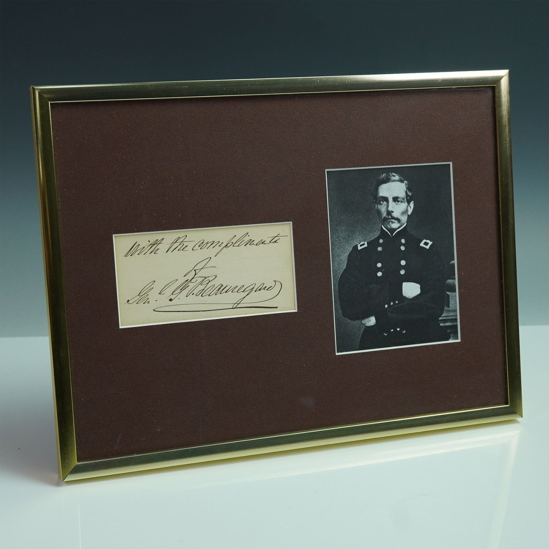 Framed autograph of Confederate General G.T. Beauregard, reading "With the compliments of Gen. G.T. Beauregard," mounted beside a printed portrait. Displayed in brown matting with a brass-finish frame.