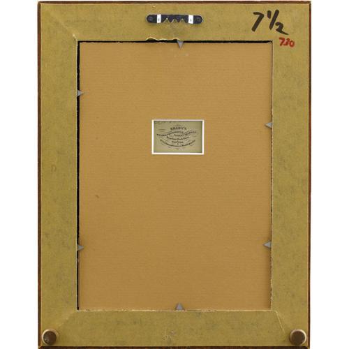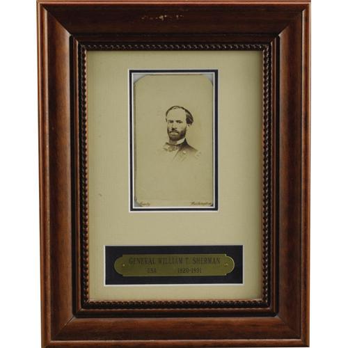 <B>Union General William T. Sherman Framed <I>Carte de Visite</B></I></B></I><B> Taken by Mathew Brady.</B></I> The image is matted, with the visible portion of the CDV measuring 2.25" x 3.75". The entire piece is framed to an overall size of 7.75" x 10". A brass nameplate underneath the image reads "GENERAL WILLIAM T. SHERMAN / USA 1820-1891". The image is the work of prolific Civil War photographer Mathew Brady. The corners of the card have been rounded. The image is in fine condition. This is a handsome display piece for any Civil War CDV collector.<BR><BR><b>Shipping:</b> Framed - with Glass, Small (<a target="_blank" href="http://www.heritageauctions.com/common/shipping.php">view shipping information</a>)