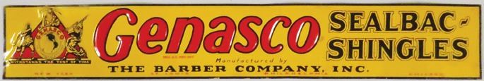 Genasco Sealbac Shingles Embossed Tin Sign. The Barber Co. Creases and light scratches otherwise very good condition. 19 3/4 X 3 inches.