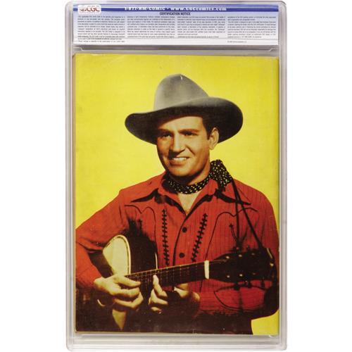 <B>Gene Autry Comics #1 Crowley Copy pedigree (Fawcett, 1942) CGC FN- 5.5 Off-white pages.</B></I> Both Gerber and Overstreet call this book ""rare"" -- it's from the singing cowboy's brief Fawcett series that preceded his long run at Dell. Autry himself is pictured, guitar in hand, on the back cover photo. Overstreet 2006 FN 6.0 value = $2,364. CGC census 3/07: 2 in 5.5, 8 higher.<BR><BR><b>Shipping:</b> Slabbed Comic (<a target=""_blank"" href=""http://www.heritageauctions.com/common/shipping.php"">view shipping information</a>)