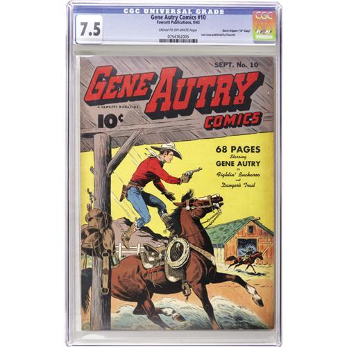 <B>Gene Autry Comics #10 Davis Crippen ("D" Copy) pedigree (Fawcett, 1943) CGC VF- 7.5 Cream to off-white pages.</B></I> This was the final issue of the Fawcett series, though Gene would continue his exploits for another decade and a half over at Dell. Overstreet 2006 VF 8.0 value = $531. CGC census 11/06: 1 in 7.5, 2 higher. <I>From the Crippen Collection.</B></I><BR><BR><b>Shipping:</b> Slabbed Comic (<a target="_blank" href="http://www.heritageauctions.com/common/shipping.php">view shipping information</a>)
