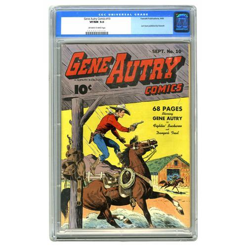 <B>Gene Autry Comics #10 (Fawcett, 1943) CGC VF/NM 9.0 Off-white to white pages.</B></I> This issue marked Gene Autry's farewell to Fawcett! Of course, he rode the range under the Dell banner for many a year thereafter. Our copy's the highest-graded copy certified by CGC as of this writing. Overstreet 2006 VF/NM 9.0 value = $841; NM- 9.2 value = $1,150. CGC census 4/06: 1 in 9.0, none higher.