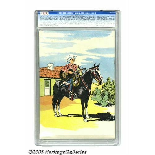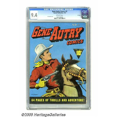 <B>Gene Autry Comics #2 File Copy (Fawcett, 1942) CGC NM 9.4 Off-white pages.</B></I> In your quest for file copies, don't overlook those from Fawcett. This beauty copy beats the second-place contender in the CGC census by 9.4 to 8.0. Hardly a contest! Overstreet 2005 NM- 9.2 value = $2,100. CGC census 9/05: 1 in 9.4, none higher. <BR><BR><B>Important notice:</B> Heritage usually auctions material at the rate of 200-250 lots per hour. On some occasions eBay Live bid software or the Internet may not be able to keep up with the pace of the auction. We recommend placing a realistic absentee bid now as insurance to avoid disappointment. Occasionally the auctioneer may eliminate or reject an eBay Live bid, and the auctioneer may also reopen a lot after the close of the eBay live bidding (usually because we missed an audience bid), and may reject your bid even if it shows you as the winning bidder. By bidding via eBay Live, you agree that Heritage may award the lot to another bidder at its sole discretion under the circumstances described above or any other reasonable circumstances. Since eBay bids are not shown to us until we open the lot on the floor, we treat those bids just like floor bids. In most cases the floor responds before the eBay bid is presented to us, due to Internet lag time, so for consistency we have made it a policy that floor bids are always considered first over tie eBay live bids. Also please note that all Heritage lots purchased through eBay Live carry a 20% Buyer's Premium. Please make sure you read the Terms and Conditions before you bid. This lot is being auctioned in conjunction with a live floor auction by Heritage Galleries & Auctioneers. All final auction and invoice information will be supplied by Heritage Galleries & Auctioneers, and all other information should be considered preliminary. Lot:2365 <BR><BR><B>Winning Notification and Billing:</B> After the FINAL session in this auction is complete, Heritage will send e-mail and snail mail in
