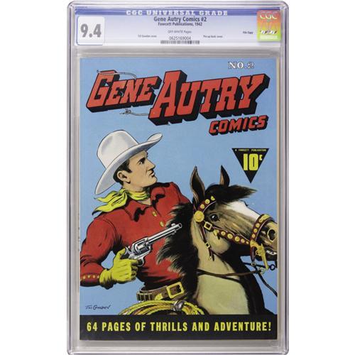 <B>Gene Autry Comics #2 File Copy (Fawcett, 1942) CGC NM 9.4 Off-white pages.</B></I> In your quest for file copies, don't overlook those from Fawcett. This beauty beats the second-place contender in the CGC census by 9.4 to 8.0. Hardly a contest! Overstreet 2006 NM- 9.2 value = $2,250. CGC census 10/06: 1 in 9.4, none higher.<BR><BR><b>Shipping:</b> Slabbed Comic (<a target="_blank" href="http://www.heritageauctions.com/common/shipping.php">view shipping information</a>)