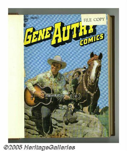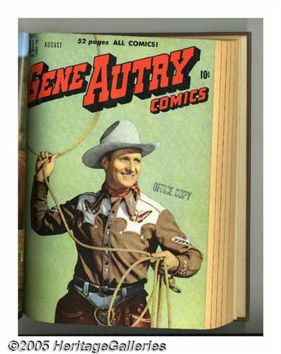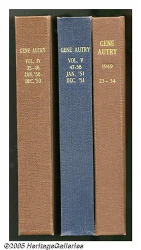 <B>Gene Autry Comics #23-58 Bound Volume (Dell, 1949-51).</B></I> These are file copies which have been trimmed and bound into three hardcover volumes. The first volume is very loose at the hinges, with the block of comics almost completely separated from the book's cover. Approximate Overstreet VG 4.0 value for group = $700. <I>From the Random House Archives.</B></I>