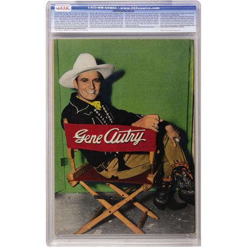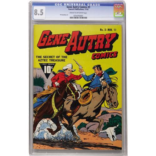 <B>Gene Autry Comics #3 (Fawcett, 1942) CGC VF+ 8.5 Cream to off-white pages.</B></I> This newly certified specimen has rocketed to near the top of CGC's census -- only the Mile High copy has been graded higher! Overstreet 2006 VF 8.0 value = $1,044; VF/NM 9.0 value = $1,647. CGC census 10/06: 1 in 8.5, 1 higher.<BR><BR><b>Shipping:</b> Slabbed Comic (<a target="_blank" href="http://www.heritageauctions.com/common/shipping.php">view shipping information</a>)