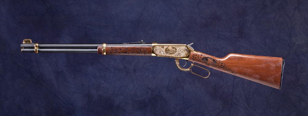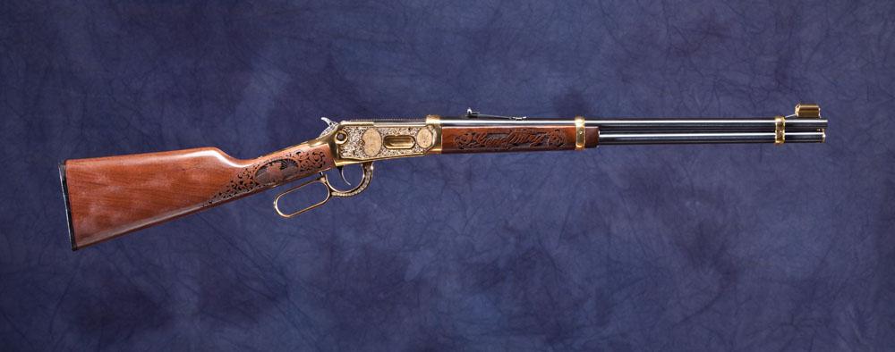 Limited Edition Gene Autry Tribute Winchester #004 of 300, sanctioned by both Gene Autry and The Autry Museum of Western Heritage in Los Angeles. Produced by America Remembers this Model 94AE Winchester .30-30 has 20” barrel and is carbine configuration. Barrel bands are hand-polished and finished in 24K gold. The lever is polished, etched with a decorative scroll, and clad in 24K gold and nickel. Highlights include a jeweled finish on the hammer and the breech bolt located on the top of the receiver. Unfired condition. * Refer to page 169 for FFA information.