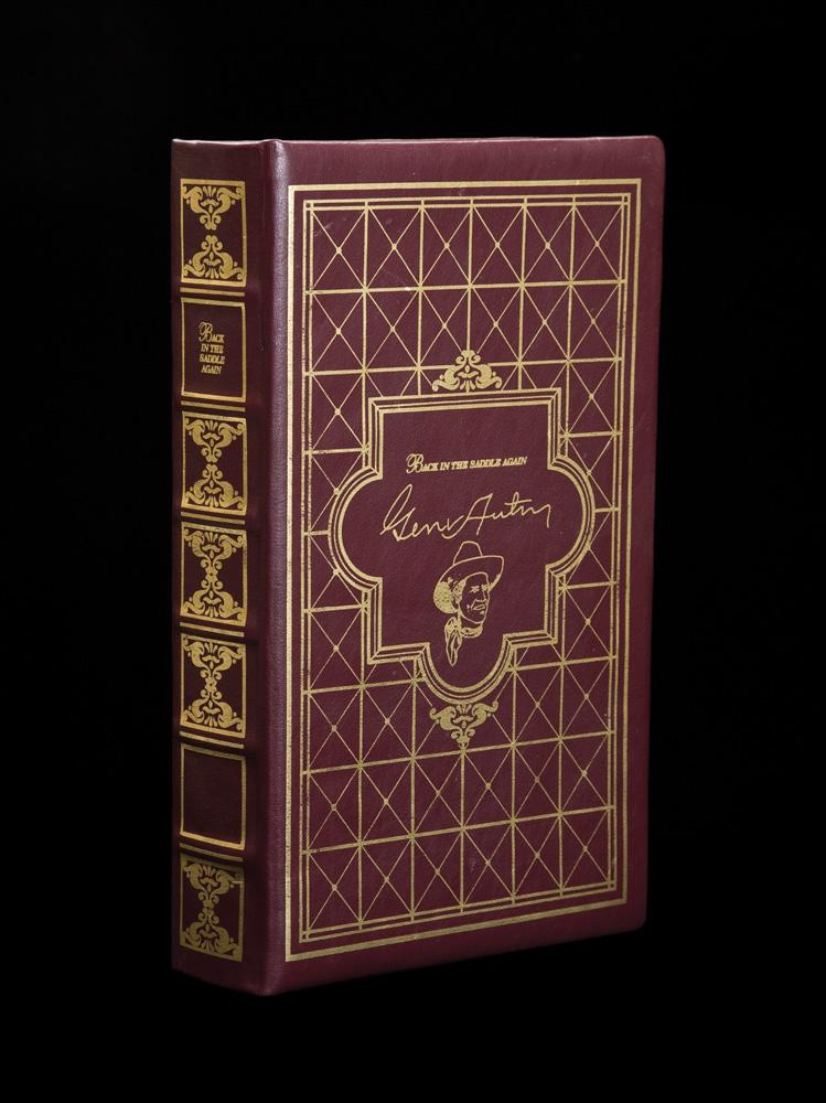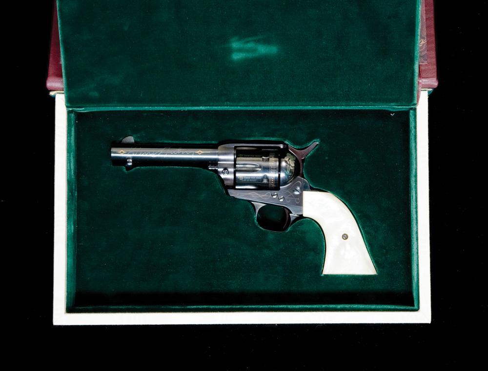 Issued by the U.S. Historical Society, Richmond, Virginia and manufactured by Uberti – Italy. This is a .45 cal., 4 3/4” replica of a Colt Single Action Model 1873 revolver with blued finish, gold inlay and pearlzite grips, in a leather book casing. Issued with The Gene Autry Western Heritage Museum. The Gene Autry Revolver is a limited edition of 1,000. The gun is embellished in nickel and 24-karat gold with images that trace the illustrious career of this true American hero. Gene’s famous portrait is etched on the recoil shield. The words of his song, Back in the Saddle Again, are etched around the cylinder. His signature is on the left side of the barrel and The Singing Cowboy on the right. On the backstrap, you’ll discover Melody Ranch, his radio show, Champion, his beloved horse, and his trademark the Flying A. And on the loading gate is the official symbol of the Autry Museum.