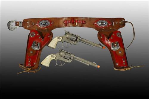 Description Includes two diecast Halco Gene Autry 44 guns with revolving cylinders. Marked "Gene Autry 44" on each gun and "LH" on grips. One is working, other needs spring adjustment and is heavily fired. Set comes with nice red leather holster and three plastic bullets. Condition (Good - Very Good). Size Largest: 11" L.