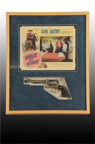 Description Lobby card and gun are framed. Revolving Cylinder Gene Autry 44L-H gun has slight pitting and one crack on handle grip. Lobby card has some creasing and minor holes. Condition (Very Good). Size Largest: 21" x 26".