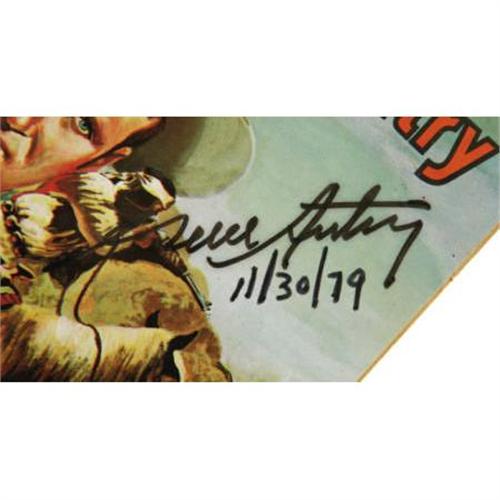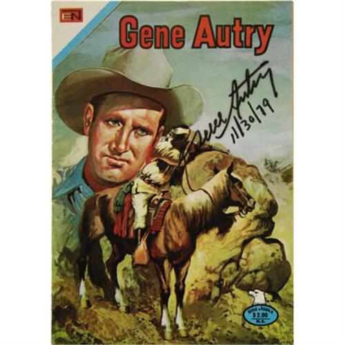 <B>Gene Autry: Signed Spanish Comic Book, <I>Gene Autry en Falsa Filmacion</B></I></B></I><B> and Other Stories.</B></I> (Racine, Wis.: Western Publishing Company, 1975). "Serie Aguila" - Ano XXII - No. 334 - 19 de Septiembre de 1975. Illustrated color wrappers with two staples, front wrapper with illustrated portrait of Autry and boldly signed by the Singing Cowboy and dated 11/30/79. Illustrated comic of 32 pages with various stories. (7.75" x 5.5"). A very good copy with only very minor soft creases to the front wrapper.<BR><BR><b>Shipping:</b> Books & Catalogs (<a target="_blank" href="http://www.heritageauctions.com/common/shipping.php">view shipping information</a>)