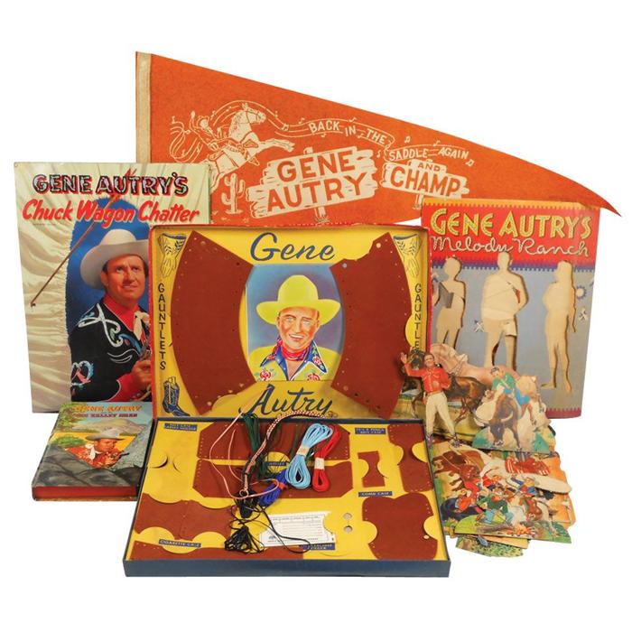 Gene Autry items, includes Hobbi Craft Kit in box, pennant, coloring book, paper doll book, etc., c. 1940's-1950's, VG to Exc cond.