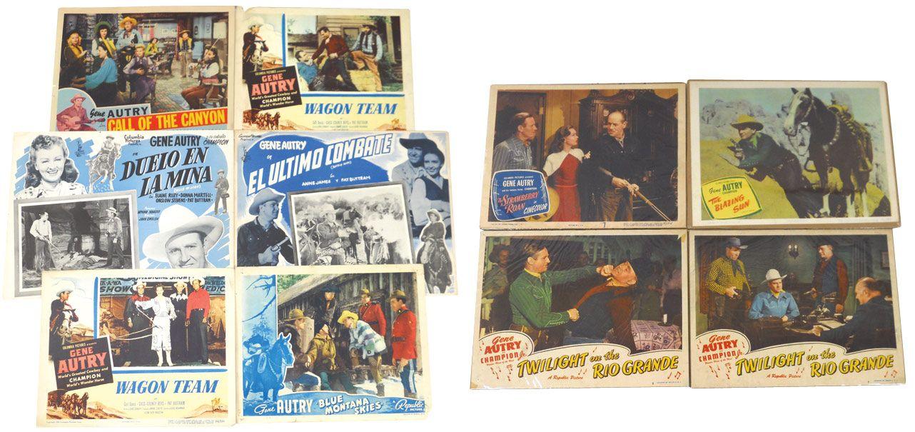 Gene Autry lobby cards (10), from The Blazing Sun, Strawberry Roan, Twilight on the Rio Grand (2), Blue Montana Skies, Call of the Canyon, Wagon Team (2), Barbed Wire & Hills of Utah, dated 1940's-1950's, all VG cond, most are 11"H x 14"W.