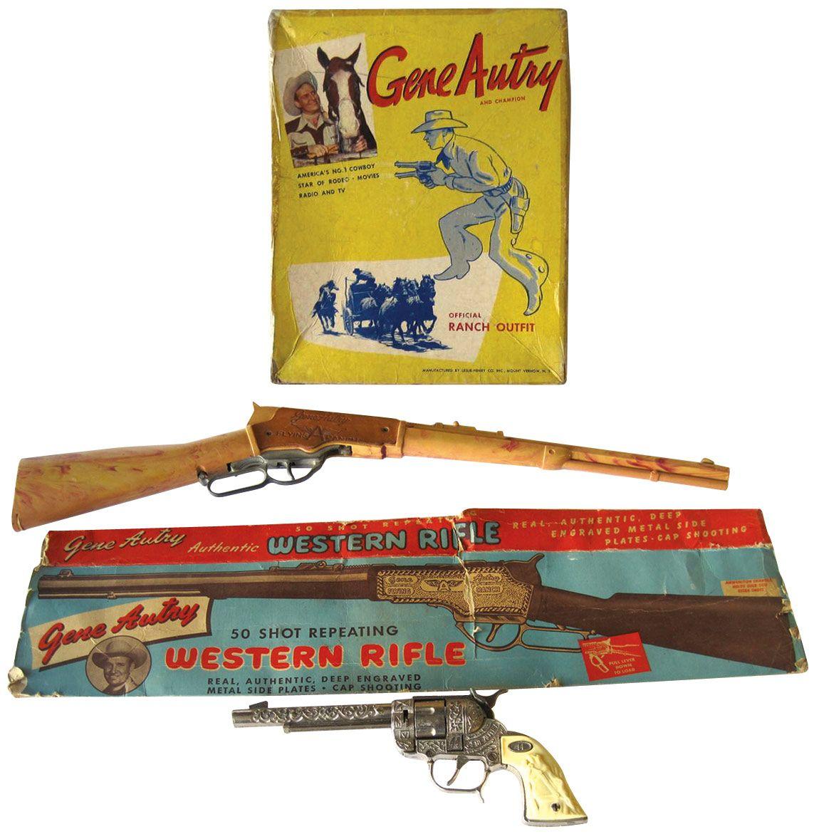 Gene Autry lot of 3: includes Flying A Ranch 50 Shot repeating rifle in orig box, 26.5"L, rifle in Exc cond, box is incomplete, Gene Autry 44 cap gun by Halco & Ranch Outfit empty box, Good to Exc cond, all c.1940's to 1950's era.