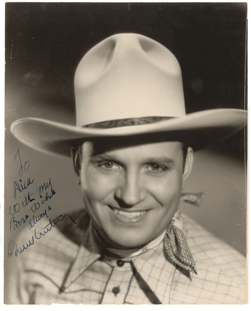 Vintage glossy 7.5 x 9.5 portrait of Autry in his cowboy hat, signed and inscribed in fountain pen “To Dick, with my best wishes always, Gene Autry.” In very good condition, with light scattered surface creases, lightly trimmed edges with some slight chipping, and a couple fingerprints to the finish.
