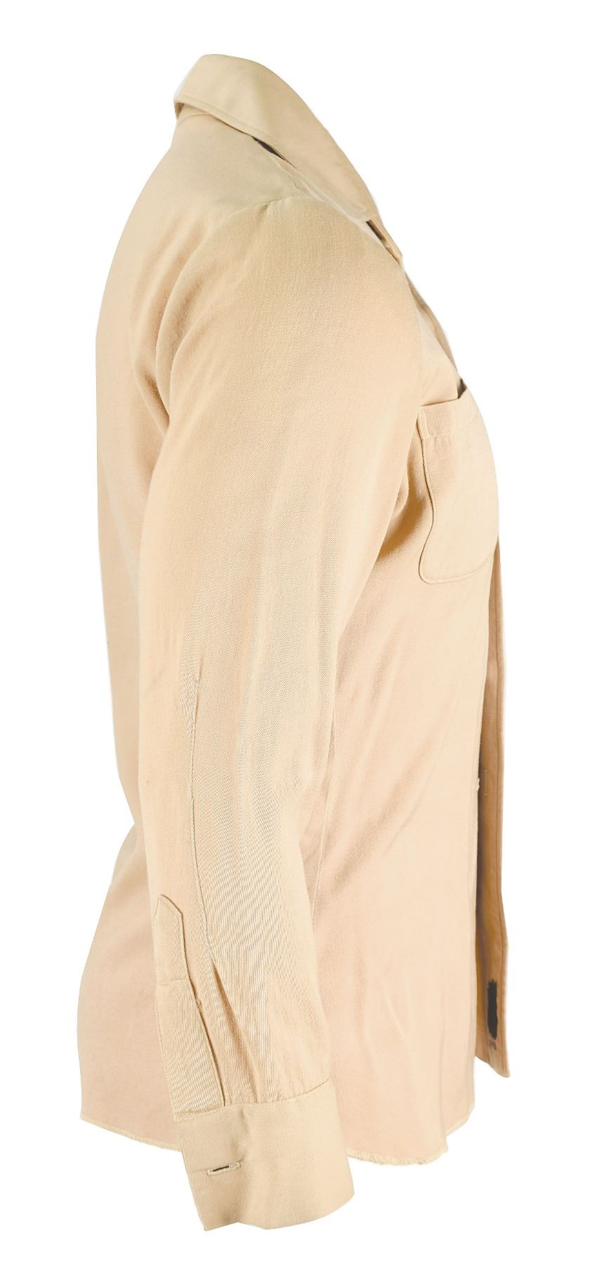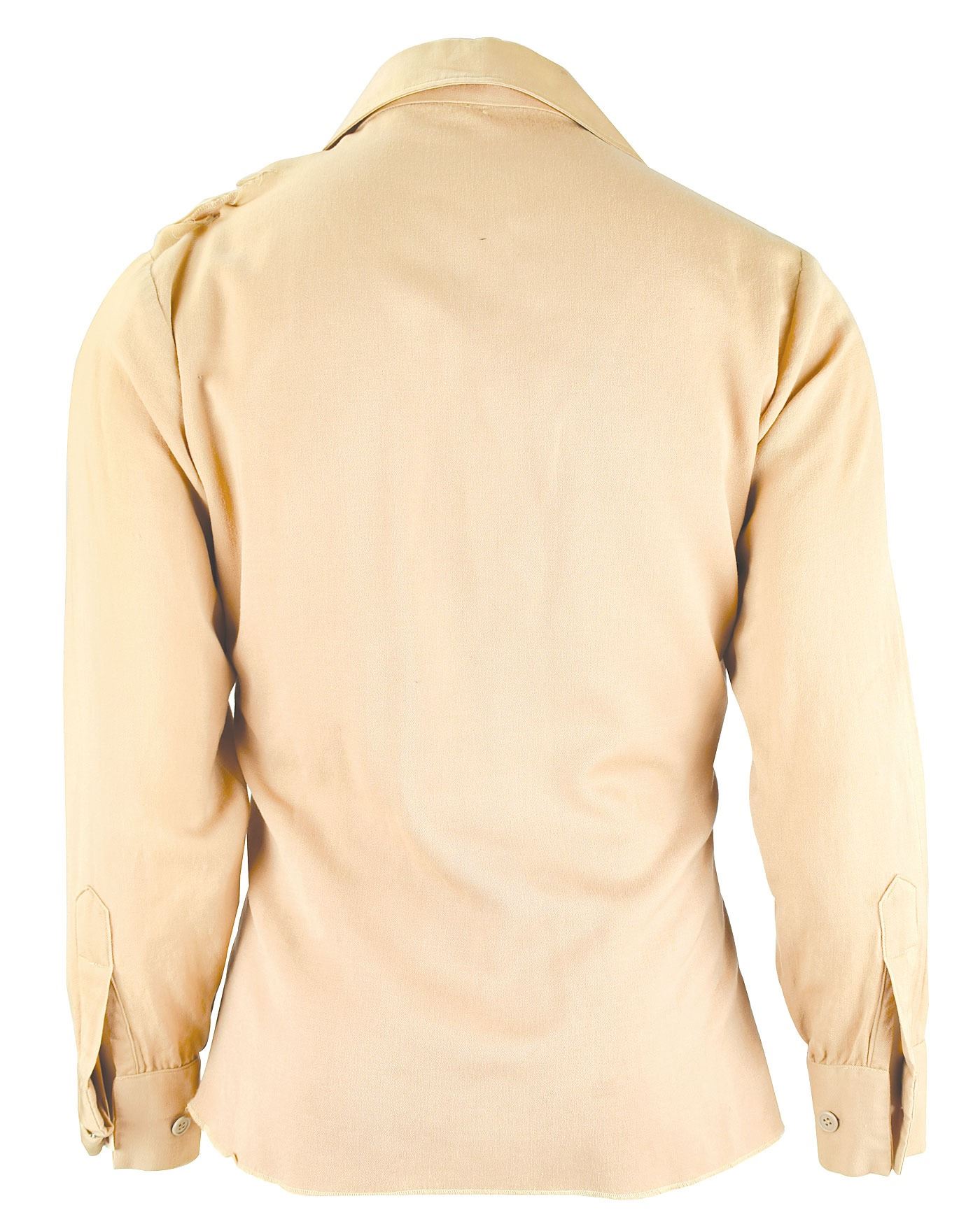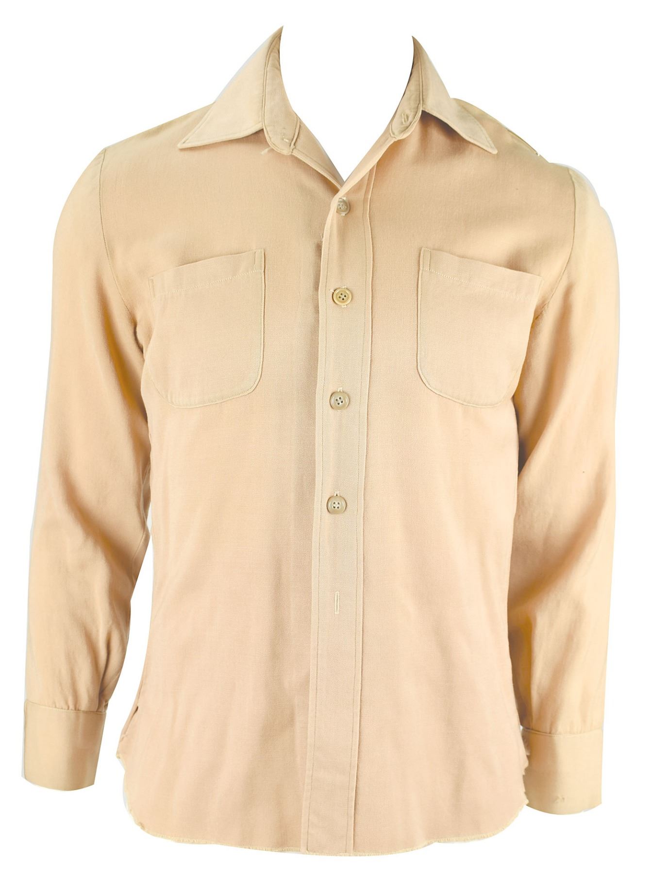 Gene Barry's screen-worn shirt from his starring role in the classic NBC television series Bat Masterson, which aired from 1958–1961. The tan long-sleeved shirt features two pouch pockets on the chest and retains four buttons down the front (one is a slightly different color, and two are missing), with a Western Costume Co. tag sewn inside the placket, filled out in type: "No. 2131-1, Name: Gene Barry, Chest: 42." In very good condition, with some fraying and staining to the back shoulder area, and repairs to a tear near the replaced button. Barry wore this type of shirt while riding from town to town, where he donned his fancy duds. He is seen in this style on the cover of the Dell comic book Bat Masterson #8, issued in October 1961.