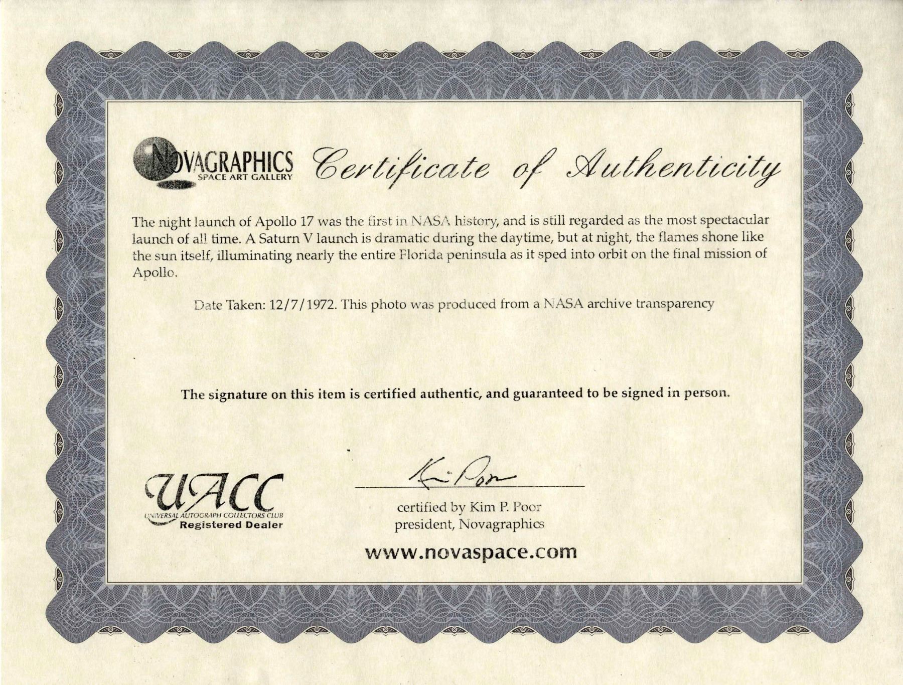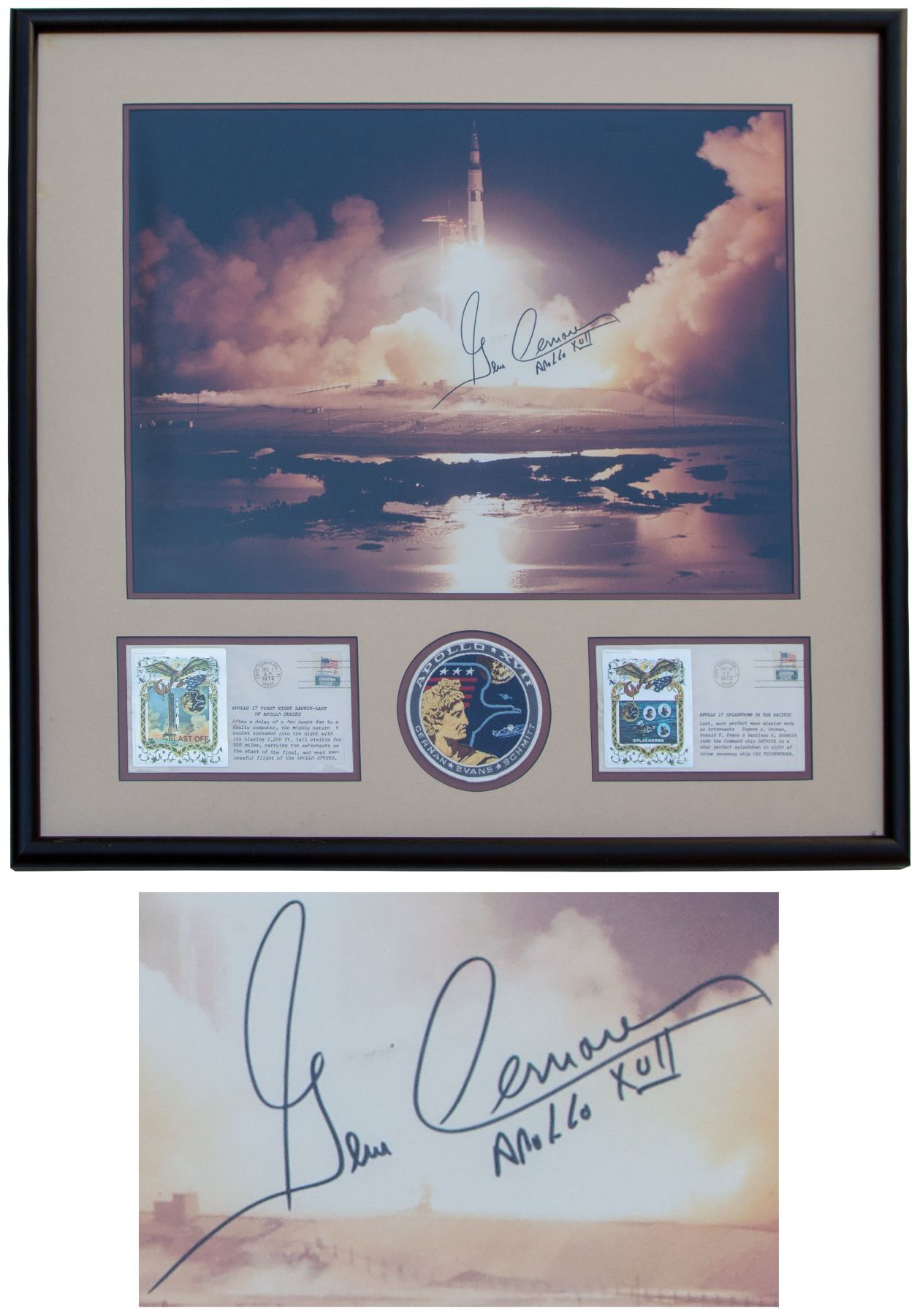 Gene Cernan signed photo of the Apollo 17 launch, the only Apollo mission to launch at night. Dramatic 19.5'' x 16'' photo is elegantly signed by Cernan in black ink across the fiery blaze, ''Gene Cernan / Apollo XVII''. Framed with two commemorative covers cancelled from Cape Canaveral on 7 and 19 December 1972, the launch and splashdown dates, as well as an Apollo 17 patch. Entire presentation measures 27'' x 27''. Near fine condition. With COA from Novaspace.