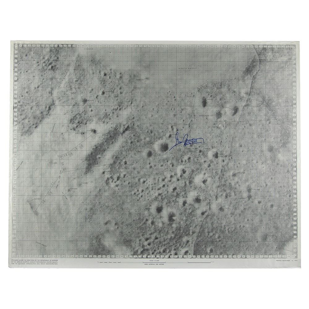 Impressive oversized 41 x 32 lunar map entitled "Taurus Littrow Apollo 17 Rover Tracking Chart, Nominal Rover Traverse Edition, Scaale 1:12,500," nicely signed at center in blue felt tip, "Gene Cernan, Apollo XVII." Prepared for NASA by the Defense Mapping Agency Topographic Center (DMATC), the chart was printed on November 16, 1972. Rolled and in fine condition, with light overall creasing and edgewear.