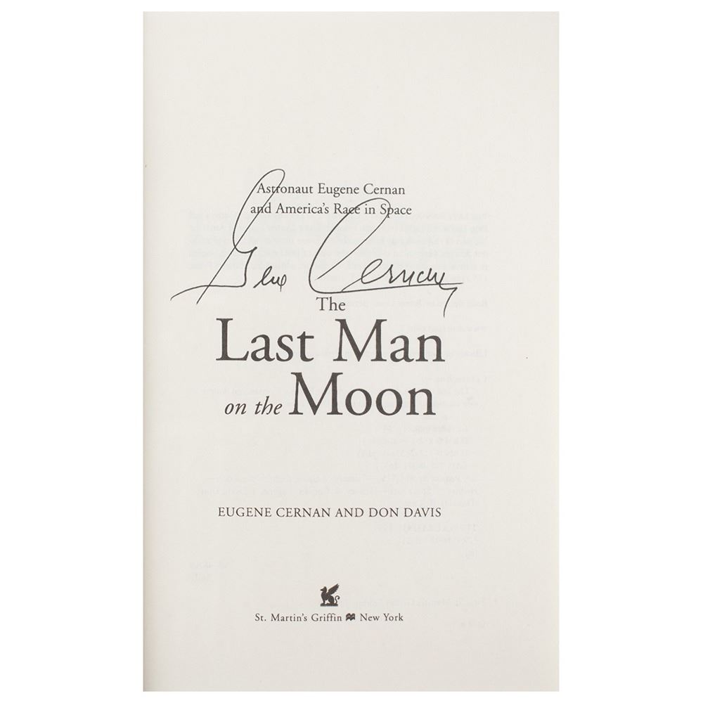 Signed book: The Last Man on the Moon. First St. Martin's Griffin Edition. NY: St. Martin's Griffin, 2000. Hardcover, 6.5 x 9.5, 356 pages. Signed on the title page in black ink by Gene Cernan. In fine condition.