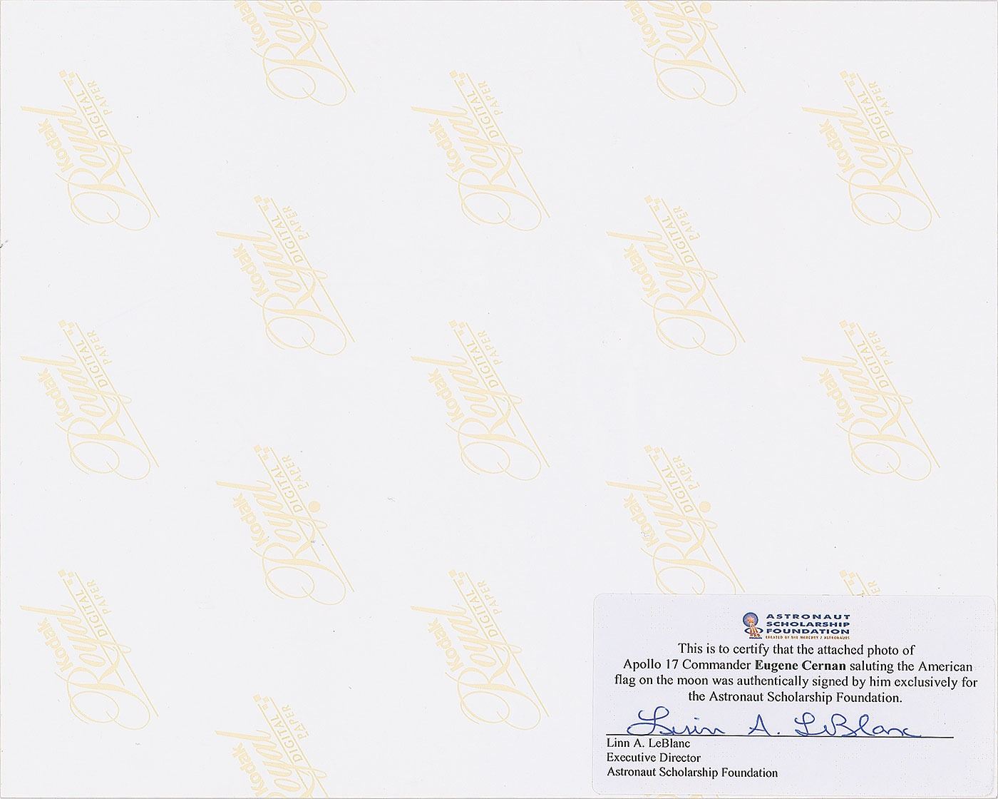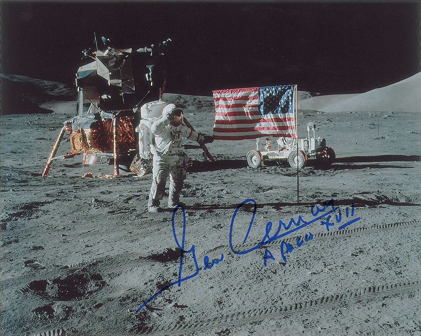 Color satin-finish 10 x 8 photo of Cernan saluting the American flag at the Apollo 17 lunar landing site, prominently signed in blue felt tip, "Gene Cernan, Apollo XVII." Reverse bears an affixed Astronaut Scholarship Foundation authentication label. In very fine condition.