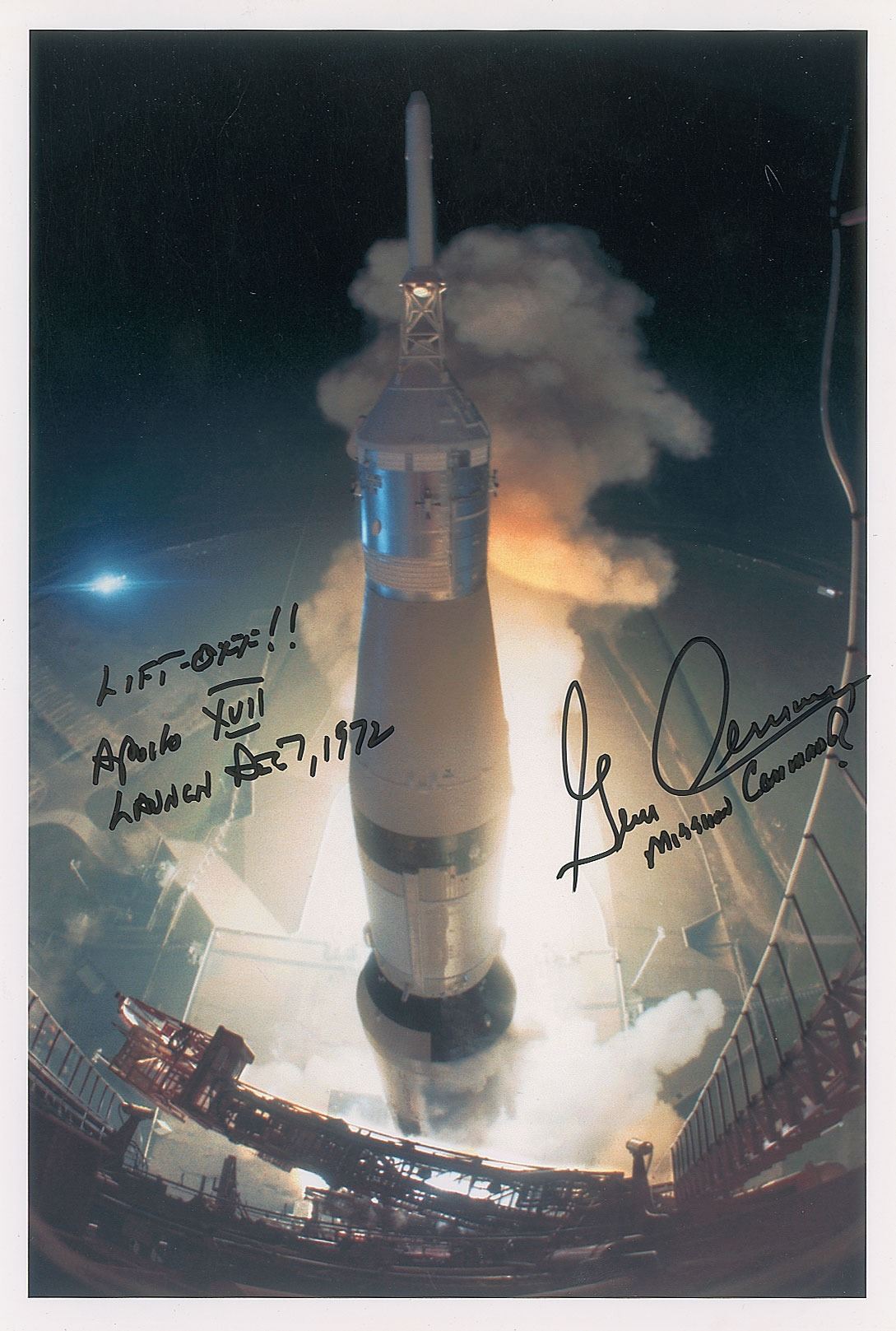 Color semi-glossy 7.5 x 11 photo of the dramatic nighttime launch of the Apollo 17 mission, signed in black felt tip, "Lift-off!! Apollo XVII, Launch Dec. 7, 1972, Gene Cernan, Mission Commander." In fine condition, with a few light surface creases. Accompanied by a certificate of authenticity from Astronaut Central.