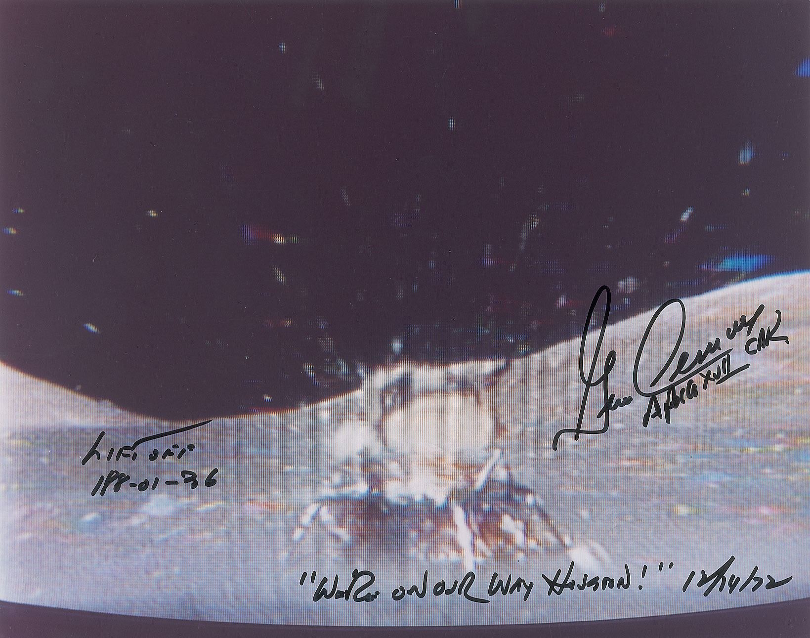 Color semi-glossy 10 x 8 photo of a televised image of the LM Challenger on the surface of the moon, signed in black felt tip, "Lift off, 188-01-36, 'We're on our way Houston!' 12/14/72, Gene Cernan, Apollo XVII CDR." In fine condition, with a few light surface creases to the top.