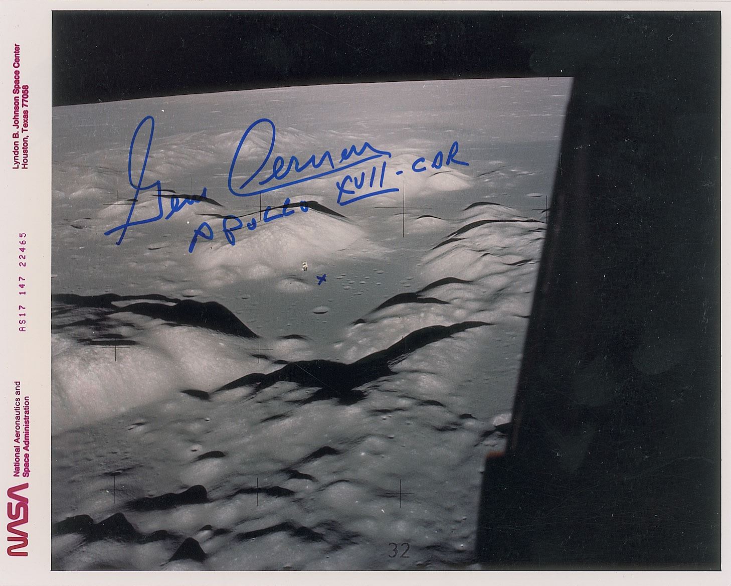 Uncommon official semi-glossy 10 x 8 red-numbered NASA photo of the Apollo 17 landing site, signed in blue felt tip, "Gene Cernan, Apollo XVII–CDR," adding a small "x" to indicate the Taurus-Littrow landing point. In fine condition, with a couple of small surface creases.