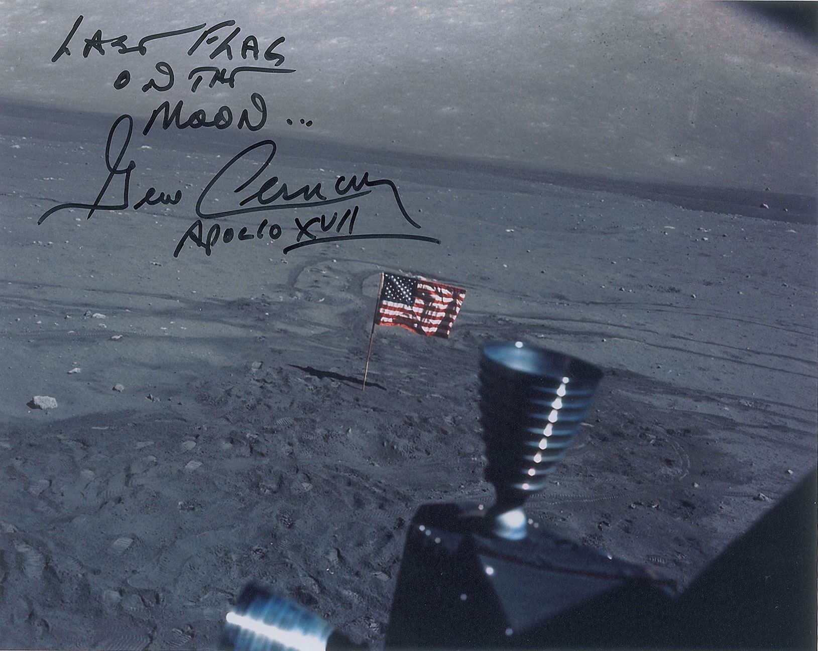 Excellent color satin-finish 10 x 8 photo of the American flag on the lunar surface, an image captured from the LM Challenger as it ascended from the Taurus-Littrow valley, signed in black felt tip, "Last flag on the moon…Gene Cernan, Apollo XVII." In very fine condition. Accompanied by a certificate of authenticity from Astronaut Central.