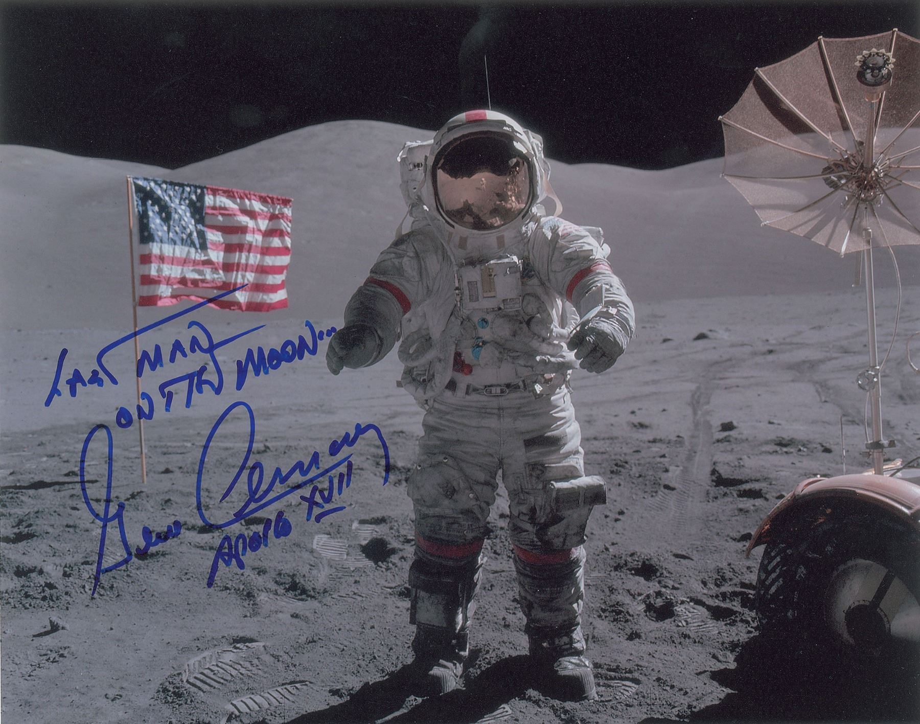 Color satin-finish 10 x 8 photo of Gene Cernan in his 'John Wayne' pose on the lunar surface, signed in blue felt tip, "Last man on the moon…Gene Cernan, Apollo XVII." In very fine condition. Accompanied by a certificate of authenticity from Astronaut Central.