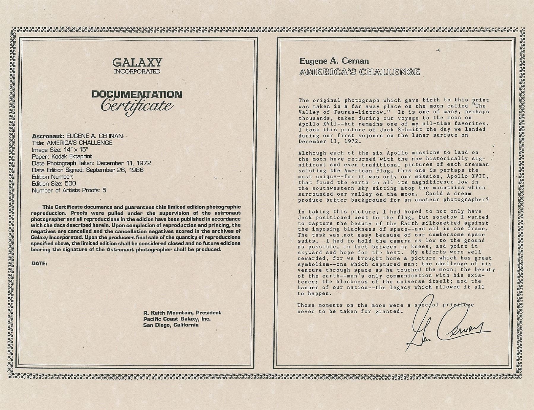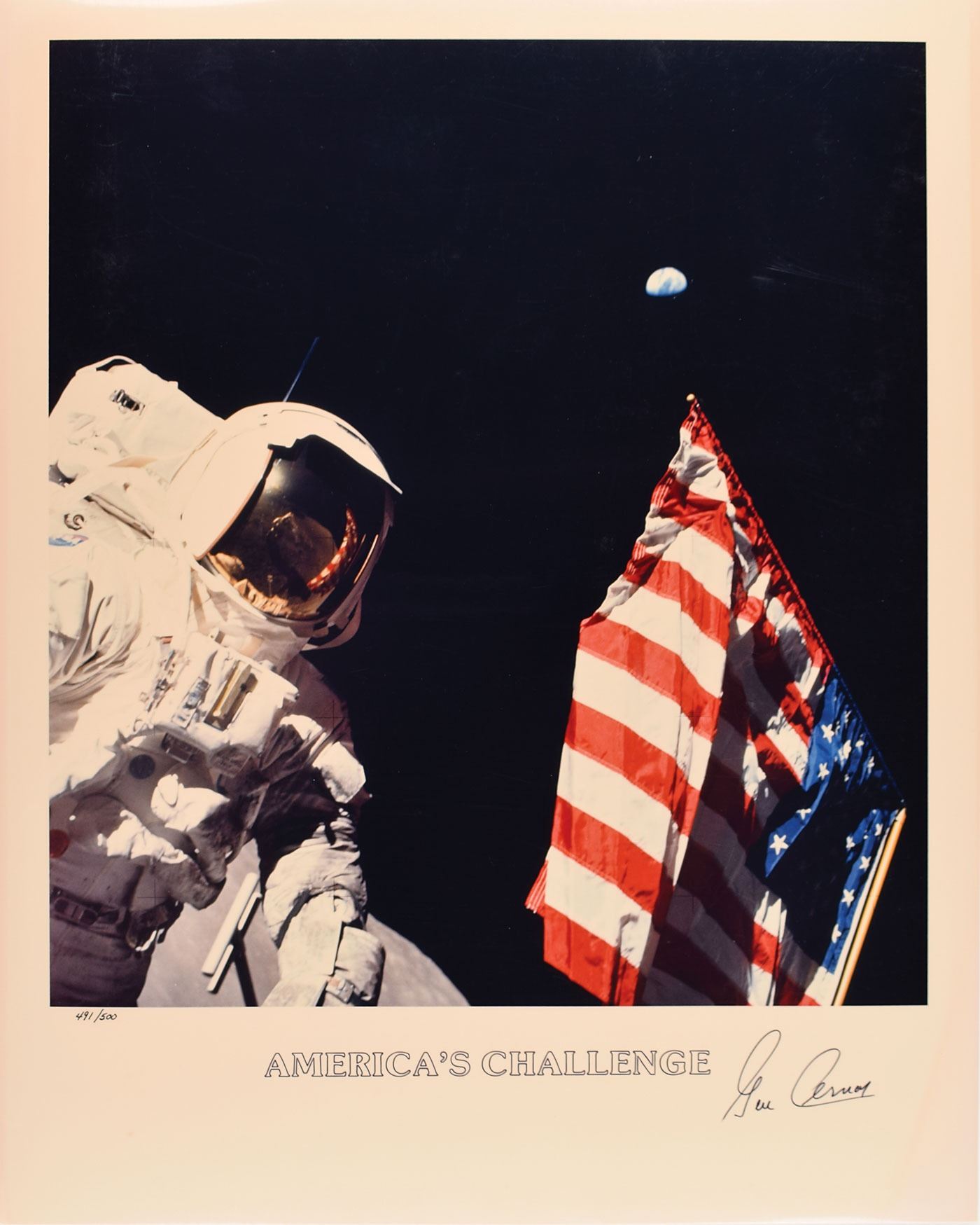 Limited edition color glossy 15.75 x 19.75 photo of Lunar Module Pilot Harrison Schmitt posing next to the American flag during an Apollo 17 EVA, with the planet Earth glowing in the distance, numbered 491/500, signed in the lower border in black felt tip by the photographer, Gene Cernan. Laminated and in fine condition. Accompanied by a certificate of authenticity from Galaxy Incorporated, which features a typed statement and preprinted signature of Cernan.