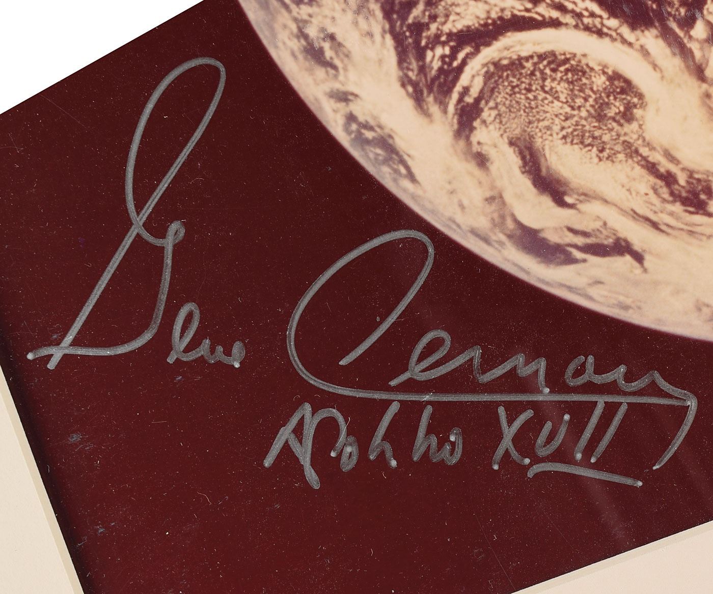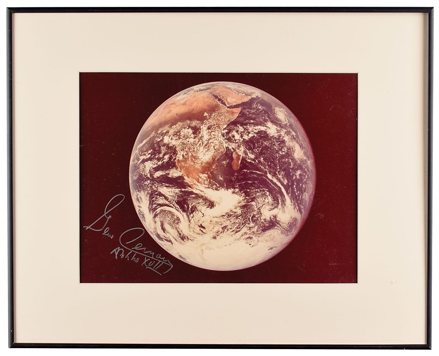 Very attractive color semi-glossy 10 x 13.25 photo of planet Earth as viewed from space, signed in silver ink, "Gene Cernan, Apollo XVII." Matted and framed to an overall size of 16.25 x 20.25. In fine condition. Accompanied by a certificate of authenticity from the Novaspace Gene Cernan Garage Sale.