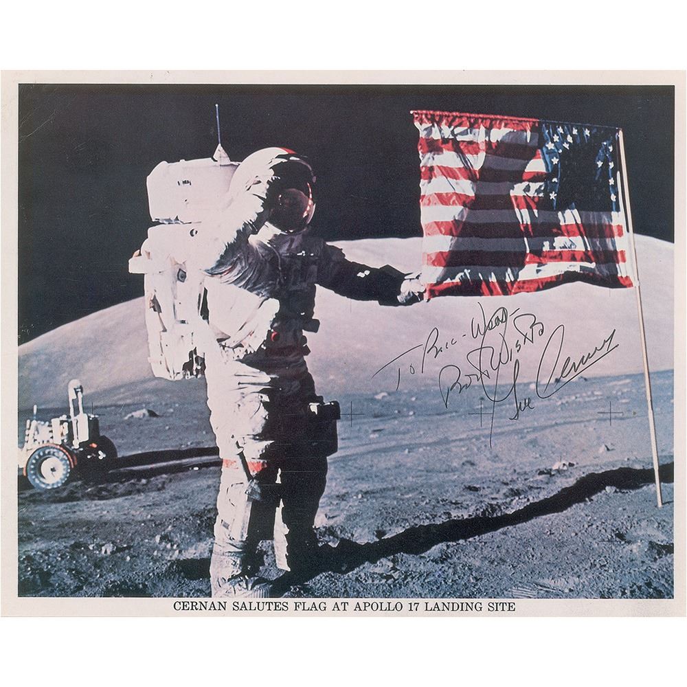 Official color 10 x 8 NASA lithograph of Gene Cernan holding and saluting the American flag during an Apollo 17 EVA, signed and inscribed in black felt tip, "To Bill Wood, Best wishes, Gene Cernan.” In fine condition, with creasing to the upper left corner.