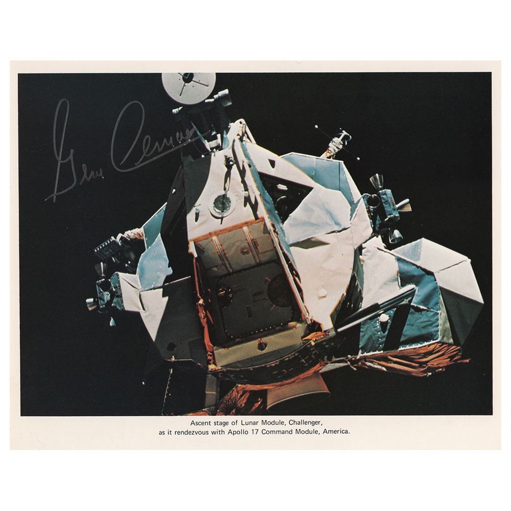Official color 10 x 8 NASA lithograph of the Lunar Module Challenger during the Apollo 17 mission, signed in silver ink by Gene Cernan. In fine condition, with a few small surface creases. Accompanied by a certificate of authenticity from Novaspace.